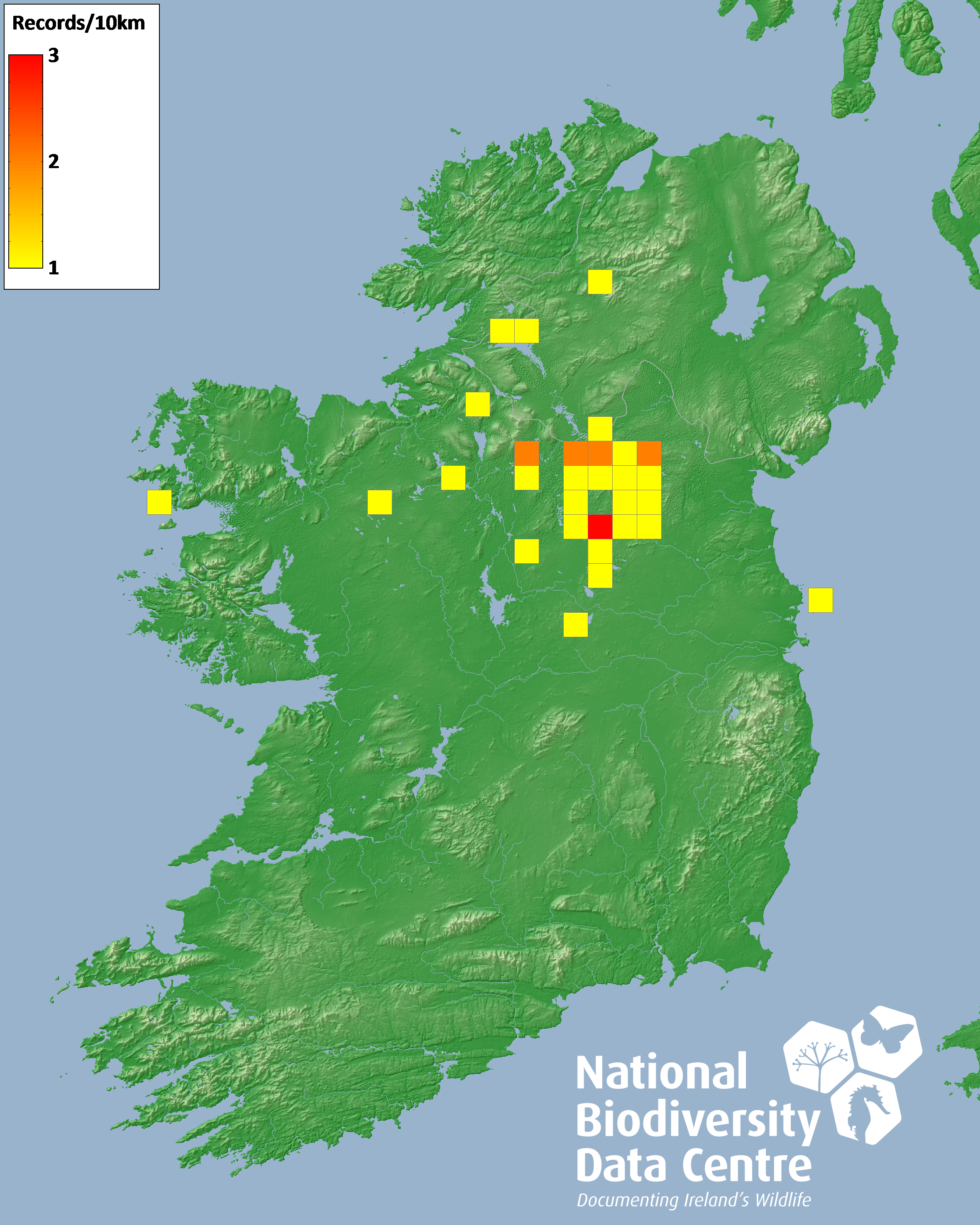 Distribution of the number of records recorded within each 10km grid square (ITM).Marine Map - 50km
