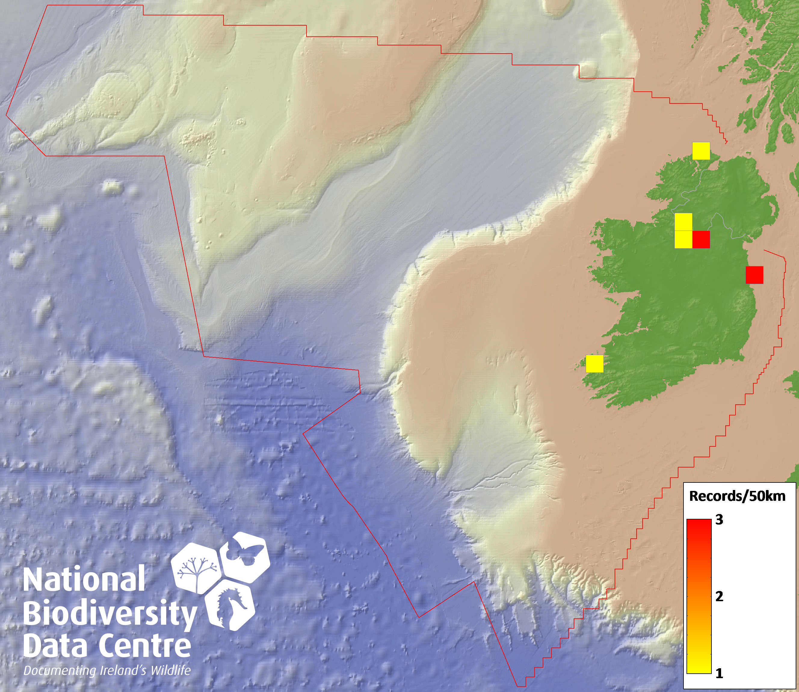 Distribution of the number of records recorded within each 10km grid square (ITM).Marine Map - 50km