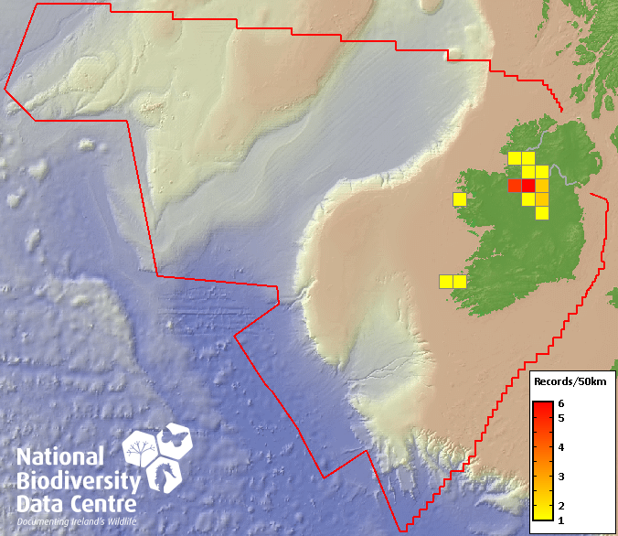 Distribution of the number of records recorded within each 10km grid square (ITM).Marine Map - 50km