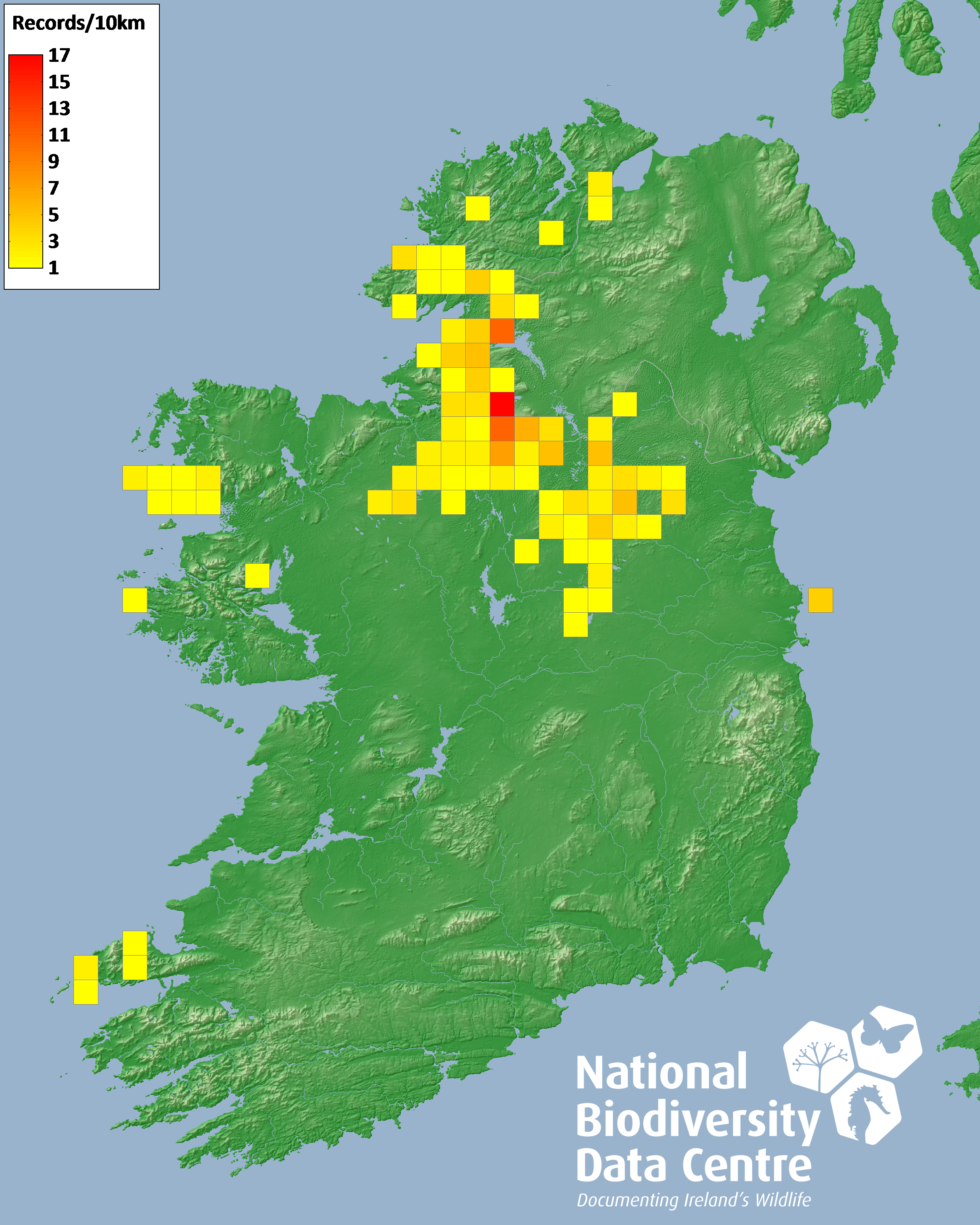 Distribution of the number of records recorded within each 10km grid square (ITM).Marine Map - 50km