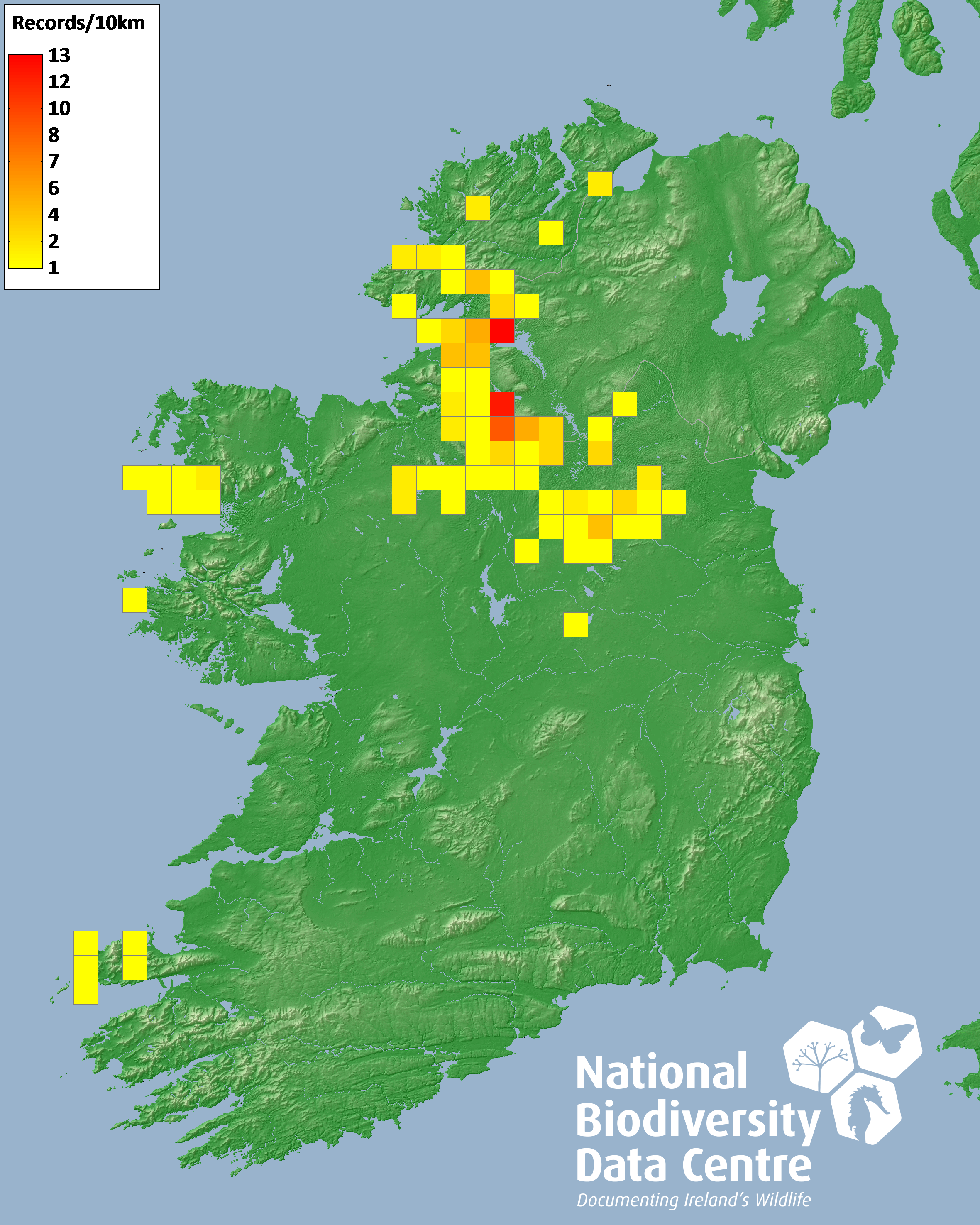 Distribution of the number of records recorded within each 10km grid square (ITM).Marine Map - 50km
