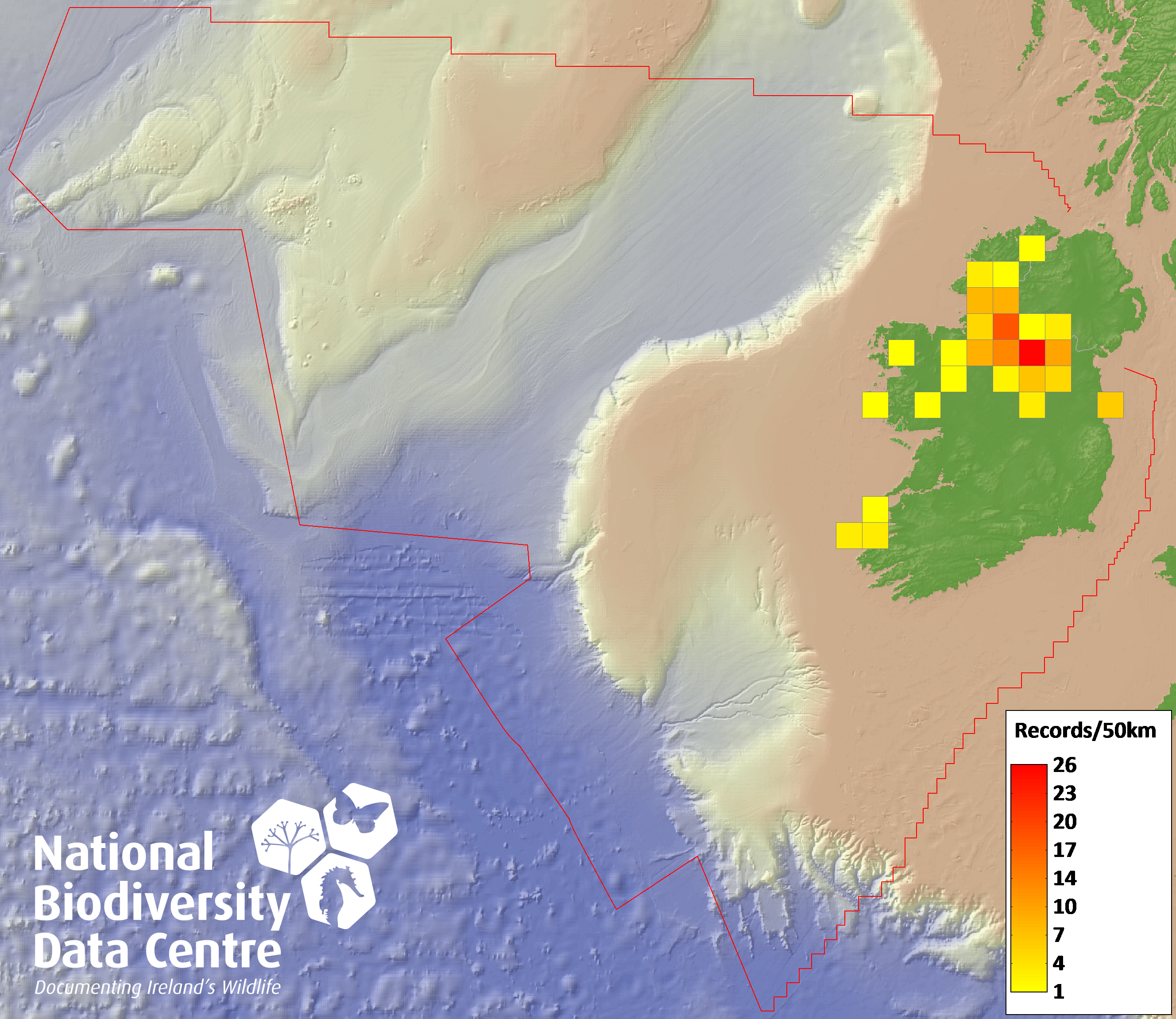 Distribution of the number of records recorded within each 10km grid square (ITM).Marine Map - 50km