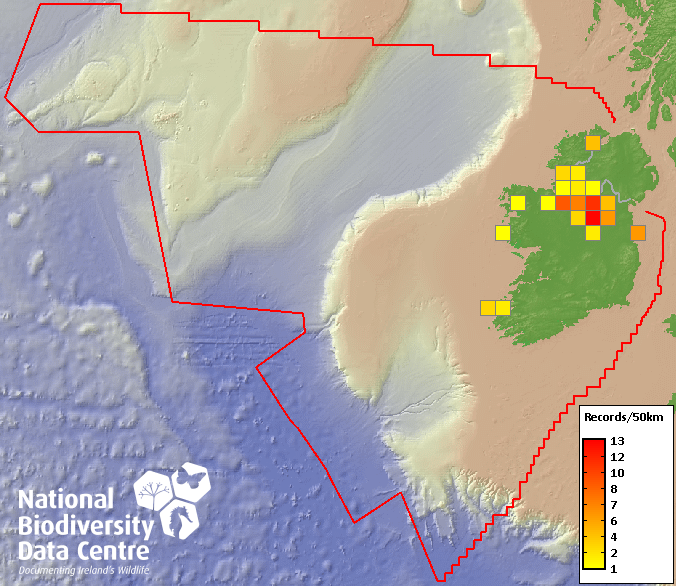Distribution of the number of records recorded within each 10km grid square (ITM).Marine Map - 50km