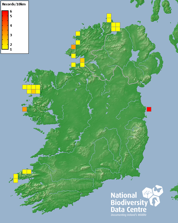 Distribution of the number of records recorded within each 10km grid square (ITM).Marine Map - 50km