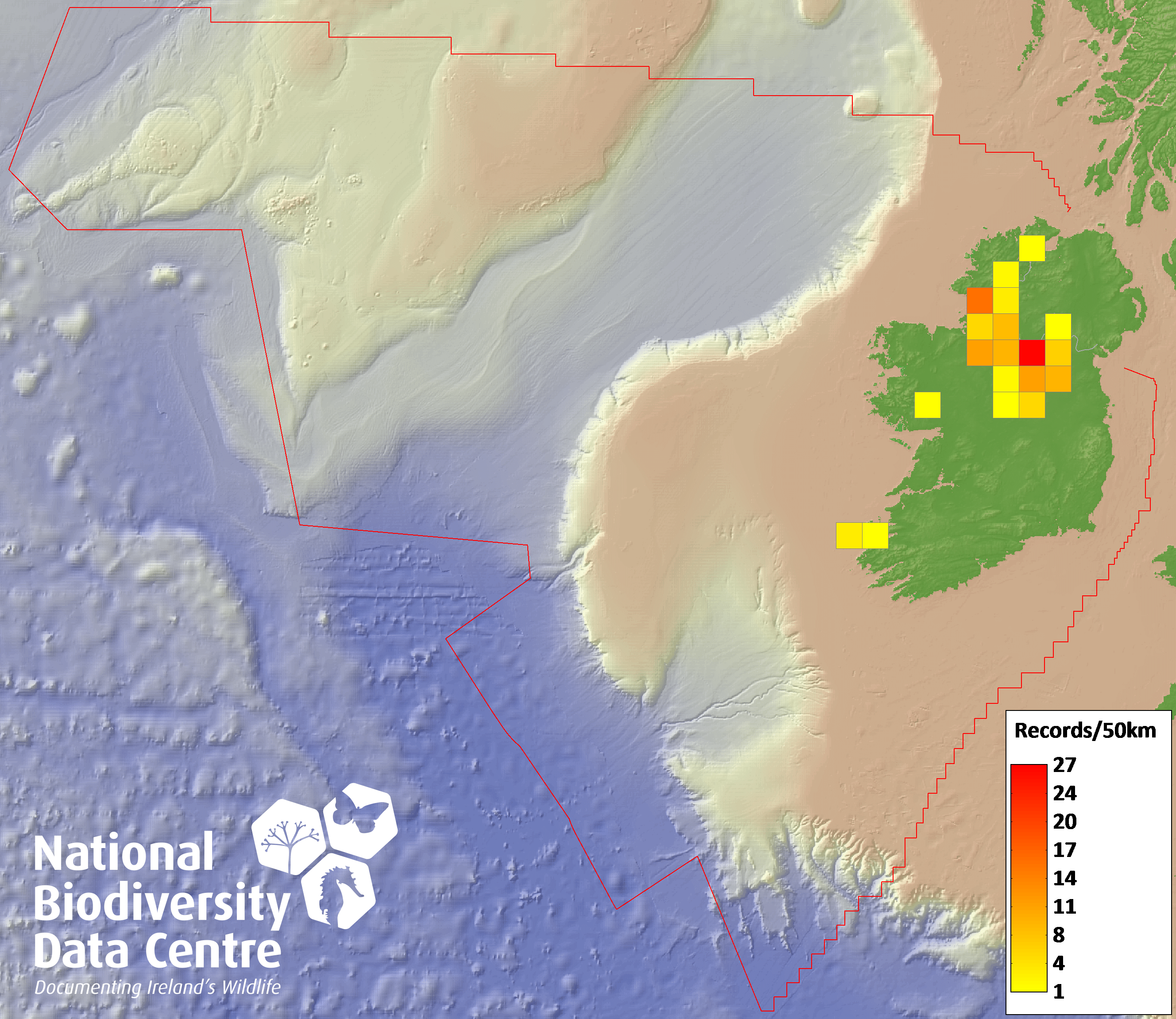 Distribution of the number of records recorded within each 10km grid square (ITM).Marine Map - 50km