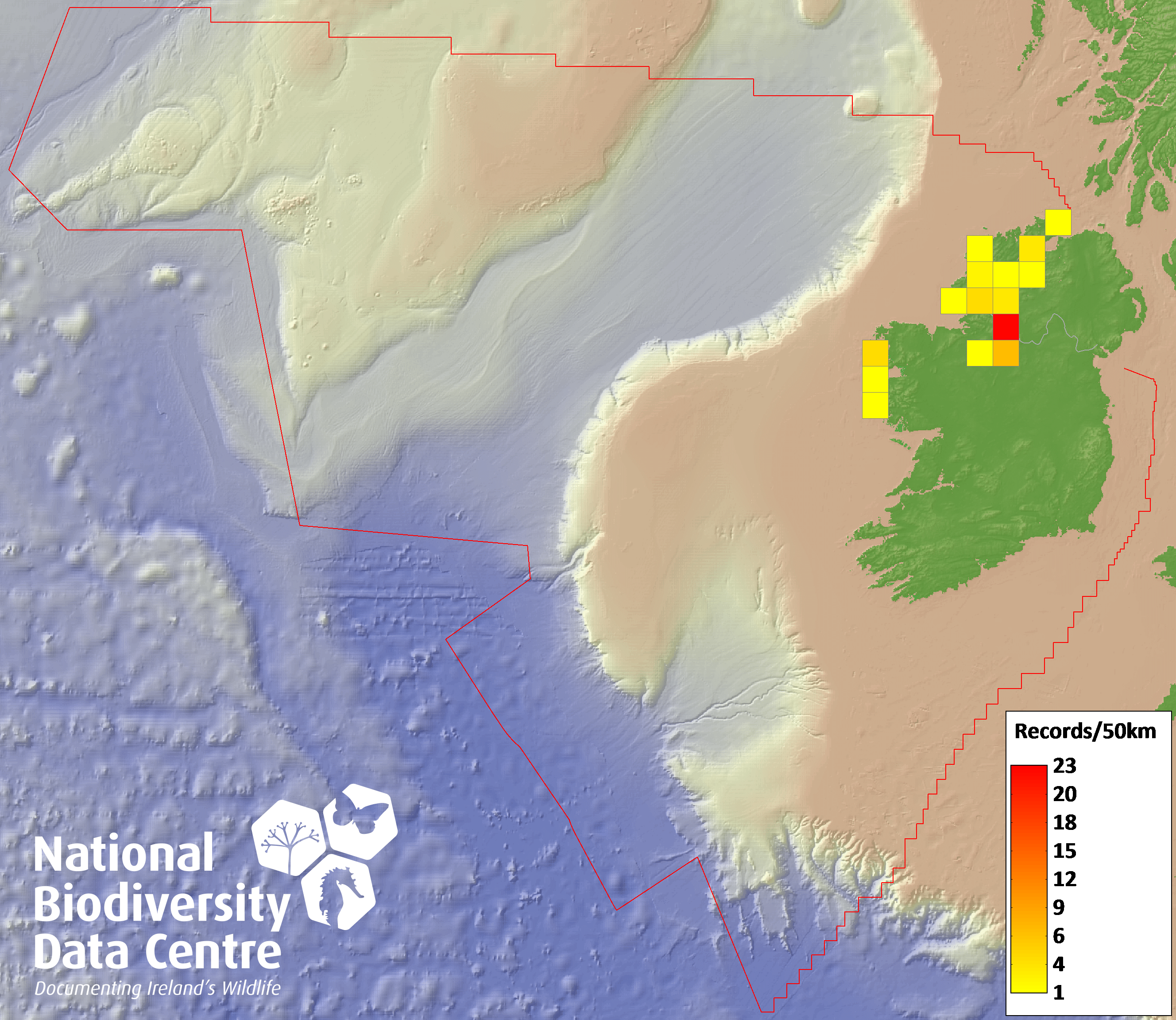 Distribution of the number of records recorded within each 10km grid square (ITM).Marine Map - 50km