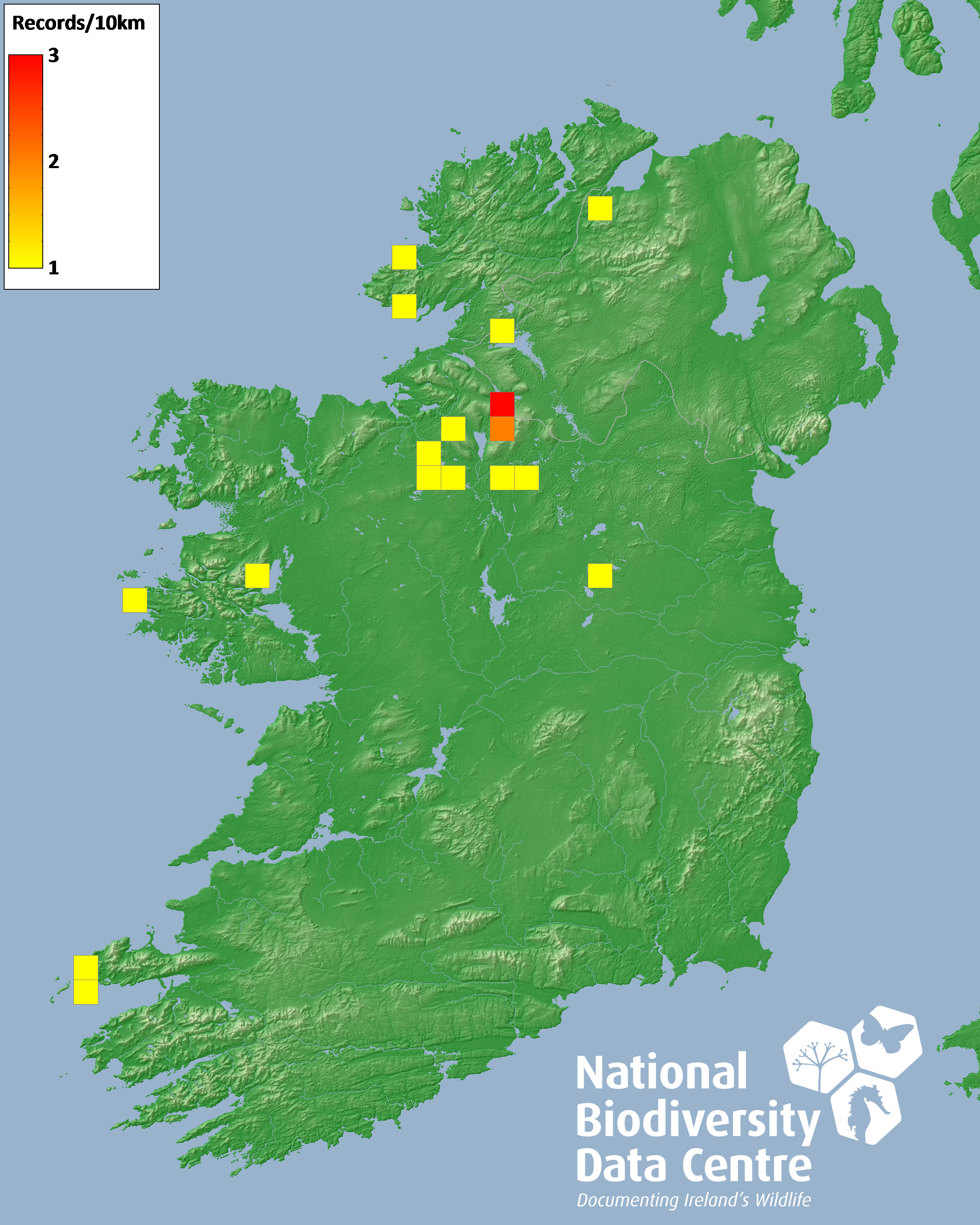 Distribution of the number of records recorded within each 10km grid square (ITM).Marine Map - 50km