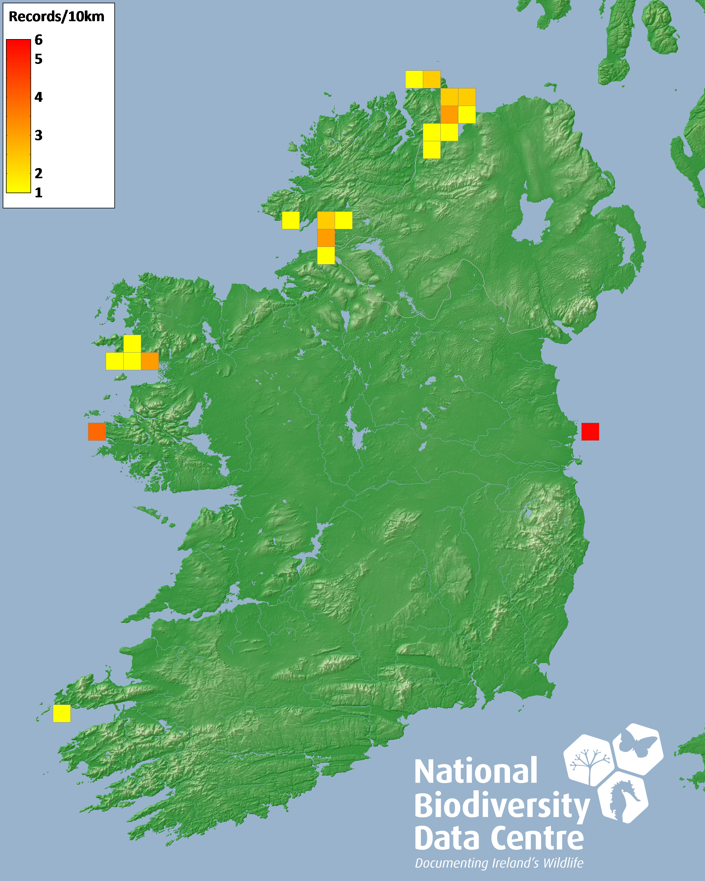 Distribution of the number of records recorded within each 10km grid square (ITM).Marine Map - 50km