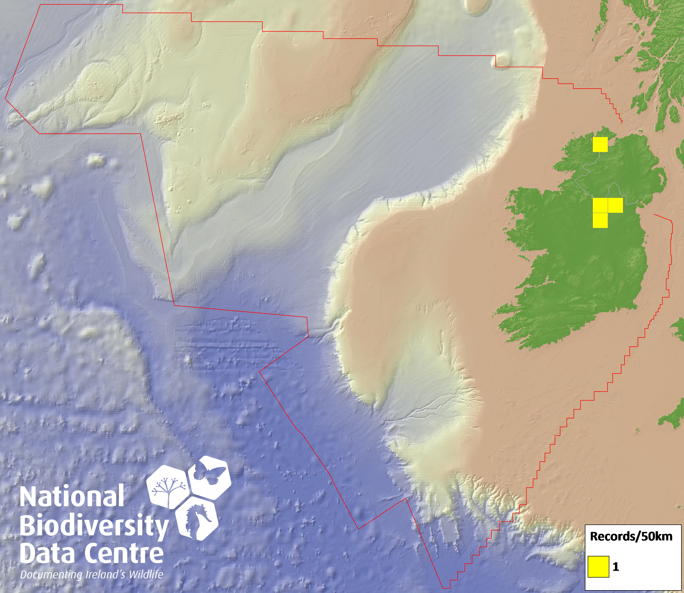 Distribution of the number of records recorded within each 10km grid square (ITM).Marine Map - 50km