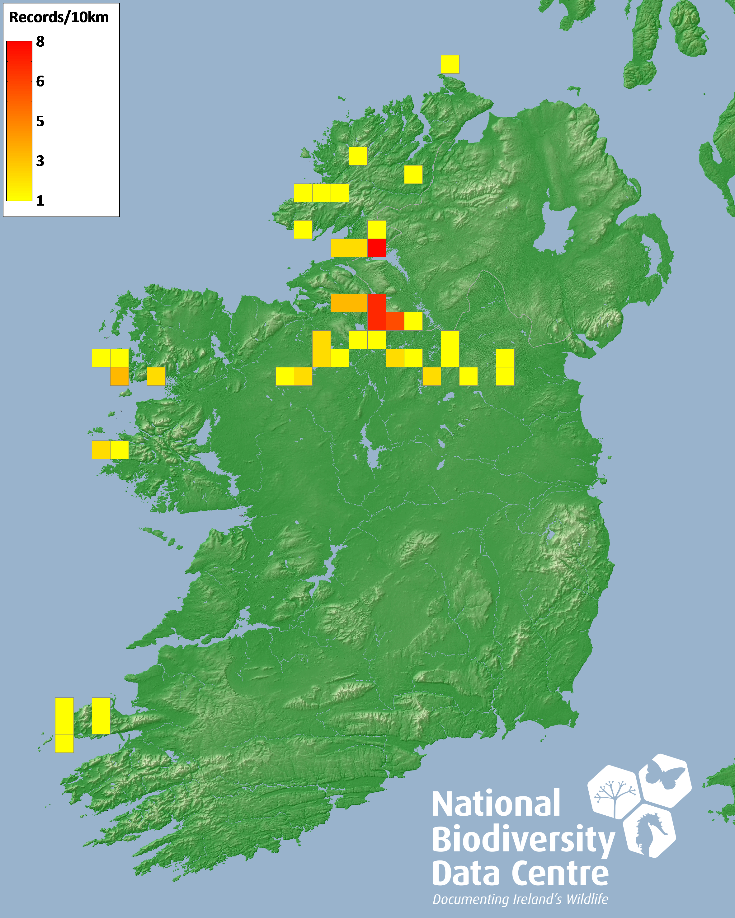 Distribution of the number of records recorded within each 10km grid square (ITM).Marine Map - 50km