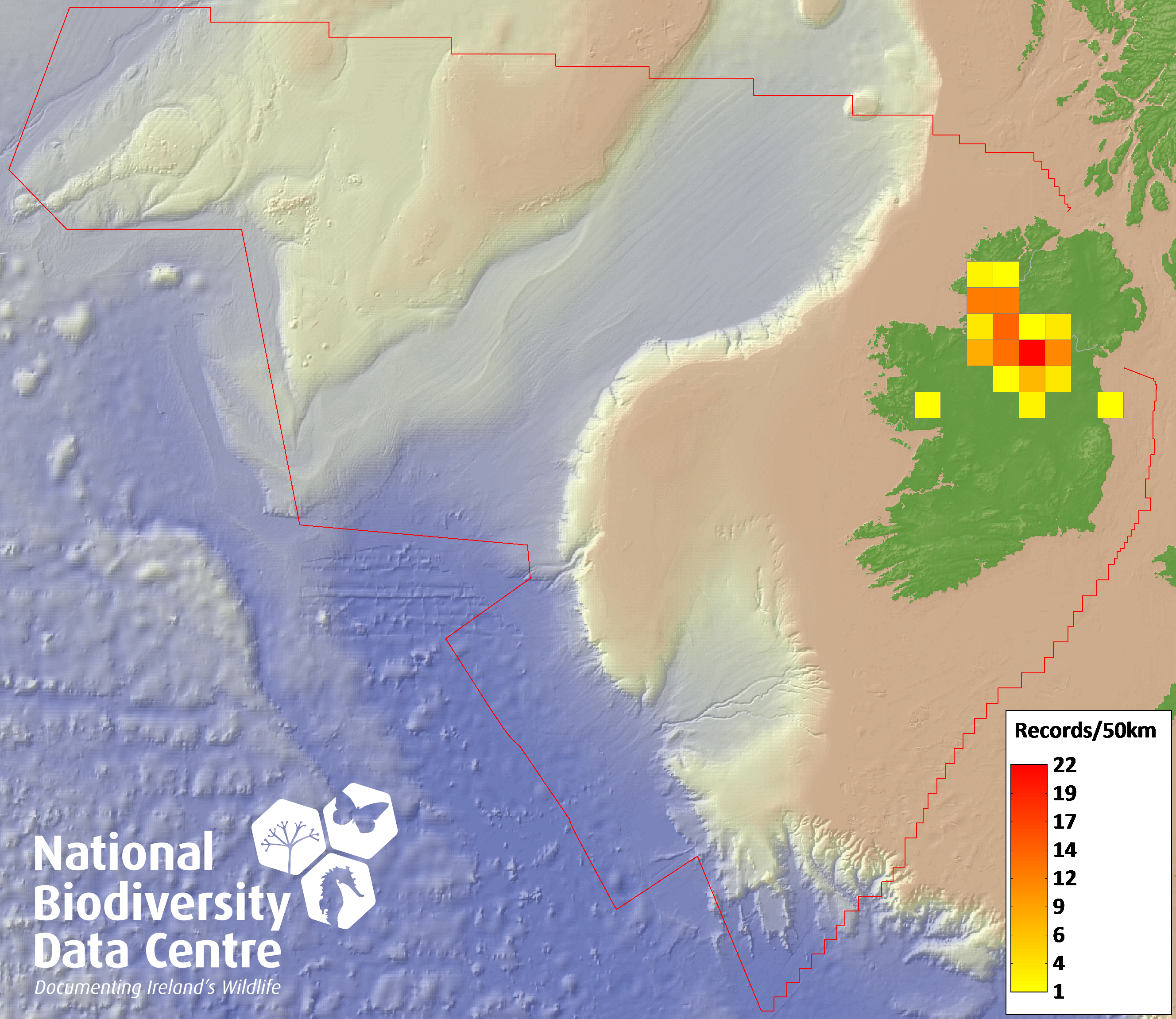 Distribution of the number of records recorded within each 10km grid square (ITM).Marine Map - 50km