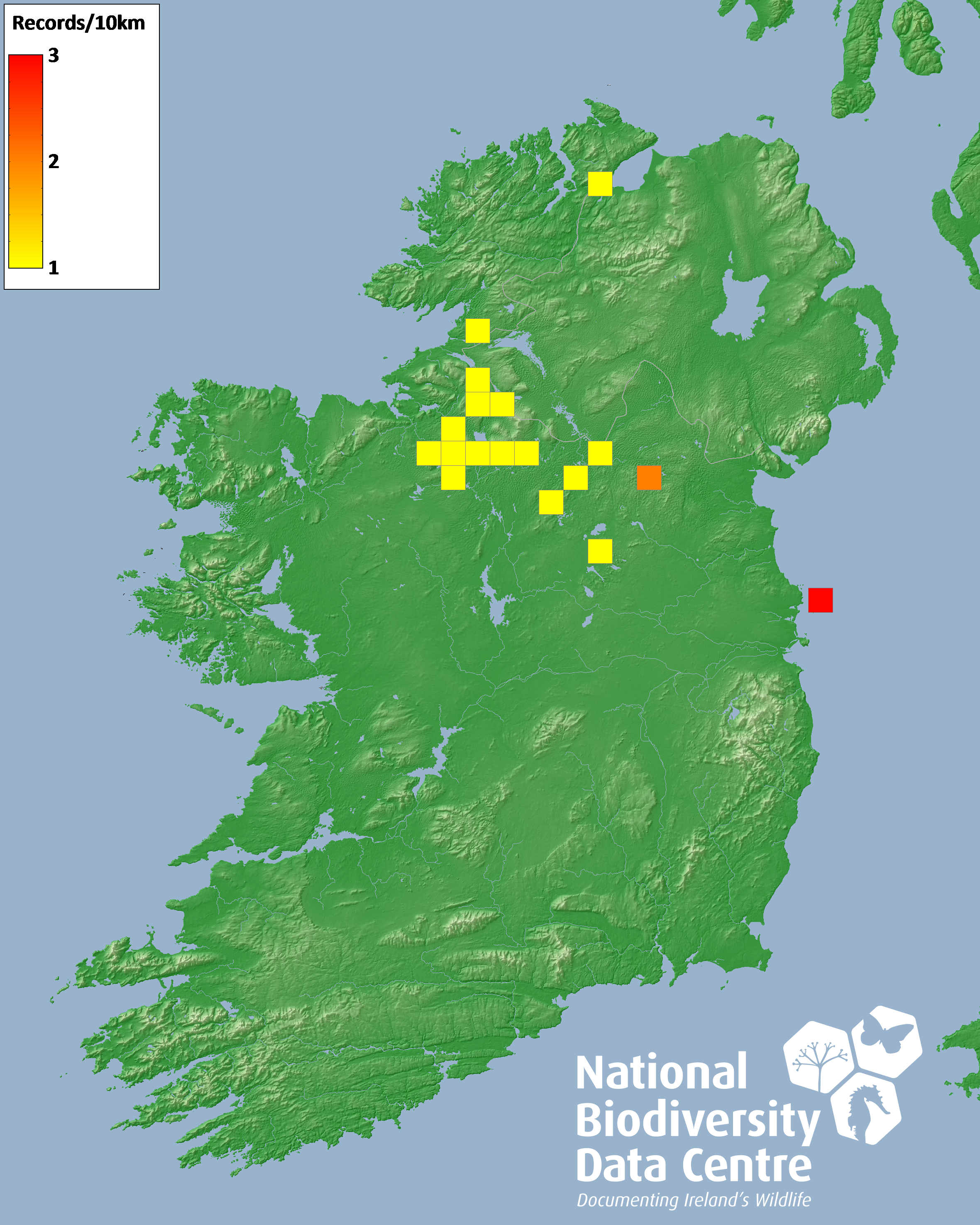 Distribution of the number of records recorded within each 10km grid square (ITM).Marine Map - 50km