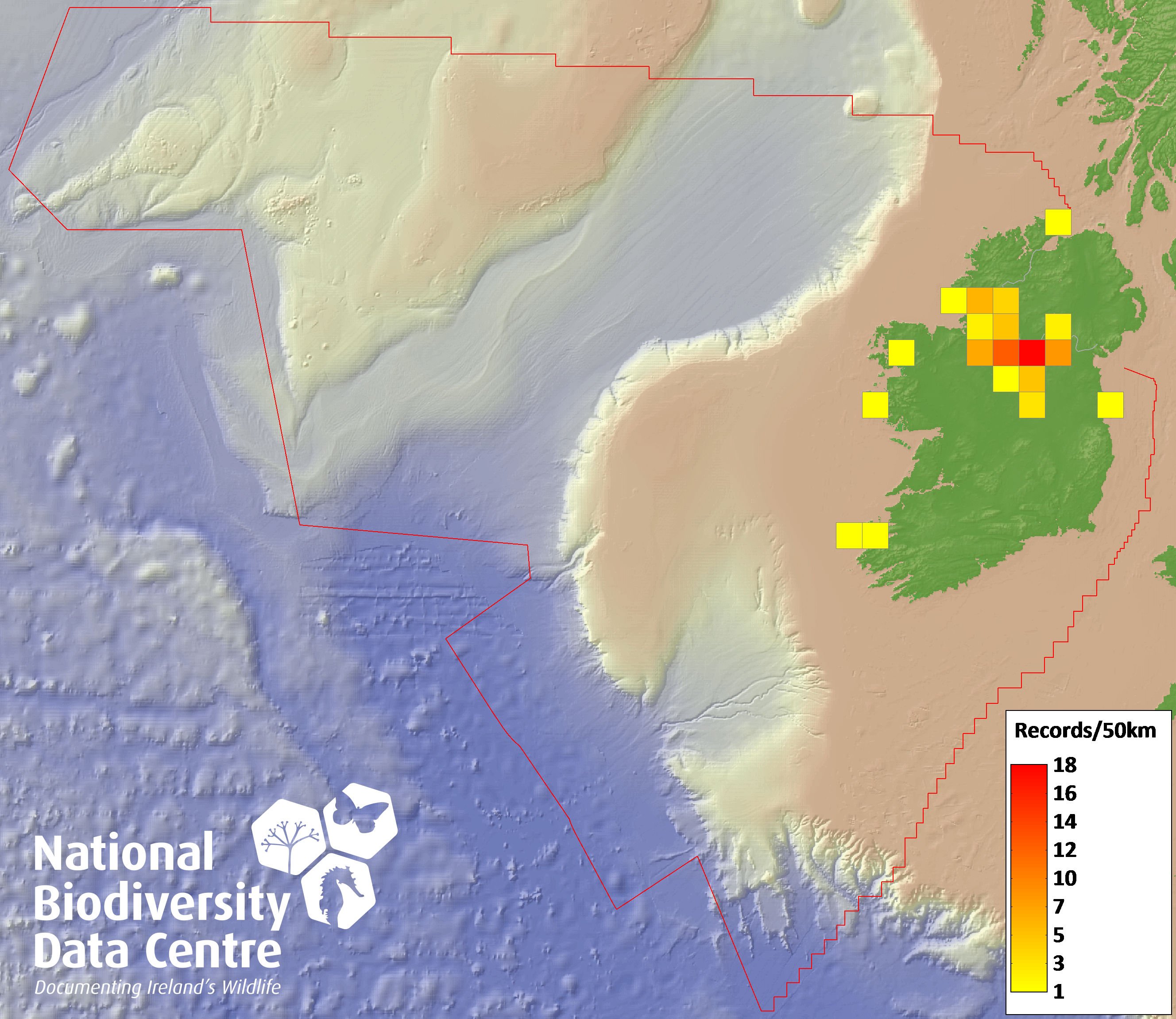 Distribution of the number of records recorded within each 10km grid square (ITM).Marine Map - 50km