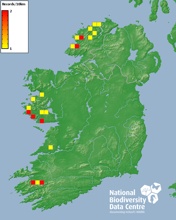 Distribution of the number of records recorded within each 10km grid square (ITM).Marine Map - 50km