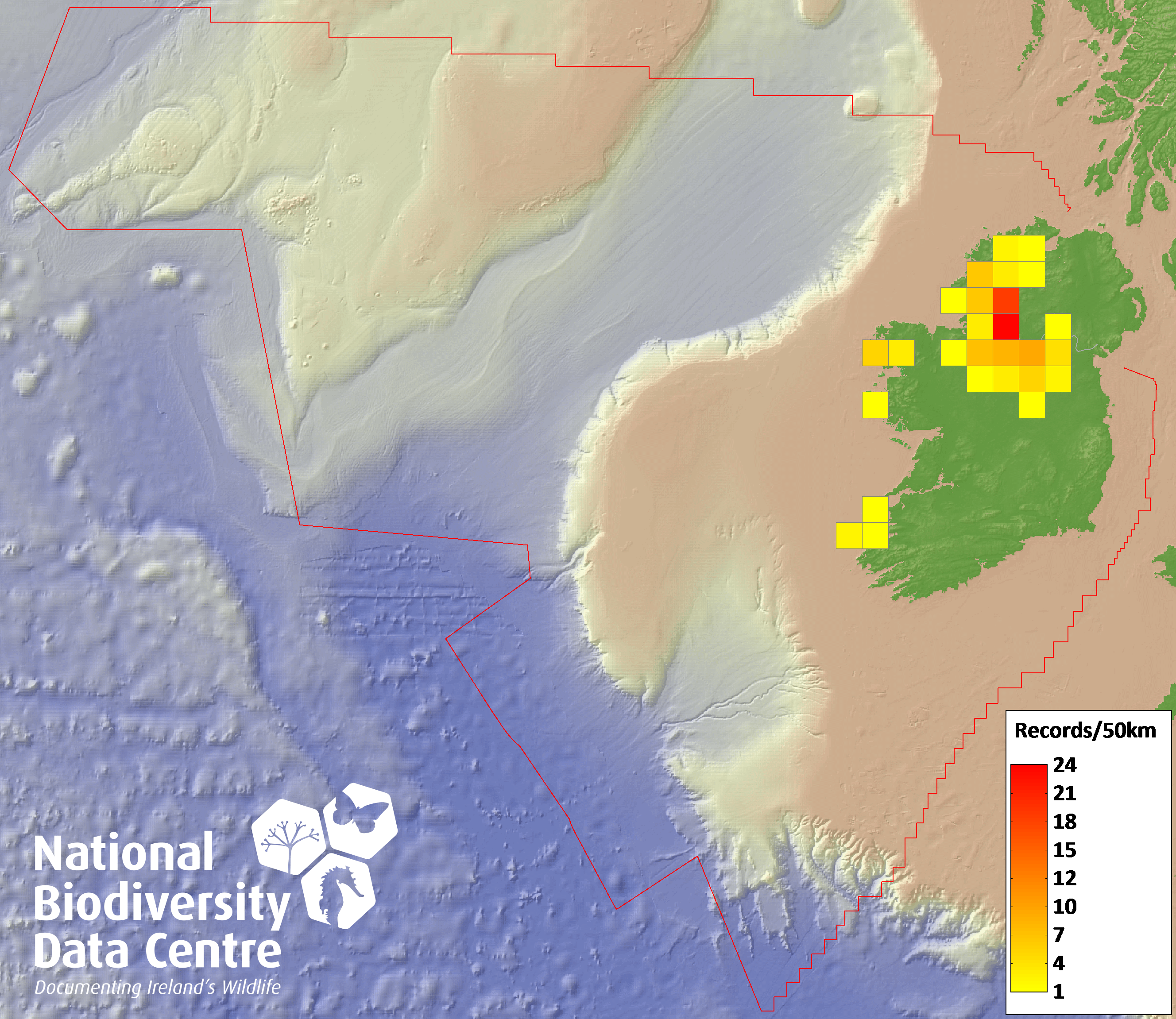 Distribution of the number of records recorded within each 10km grid square (ITM).Marine Map - 50km