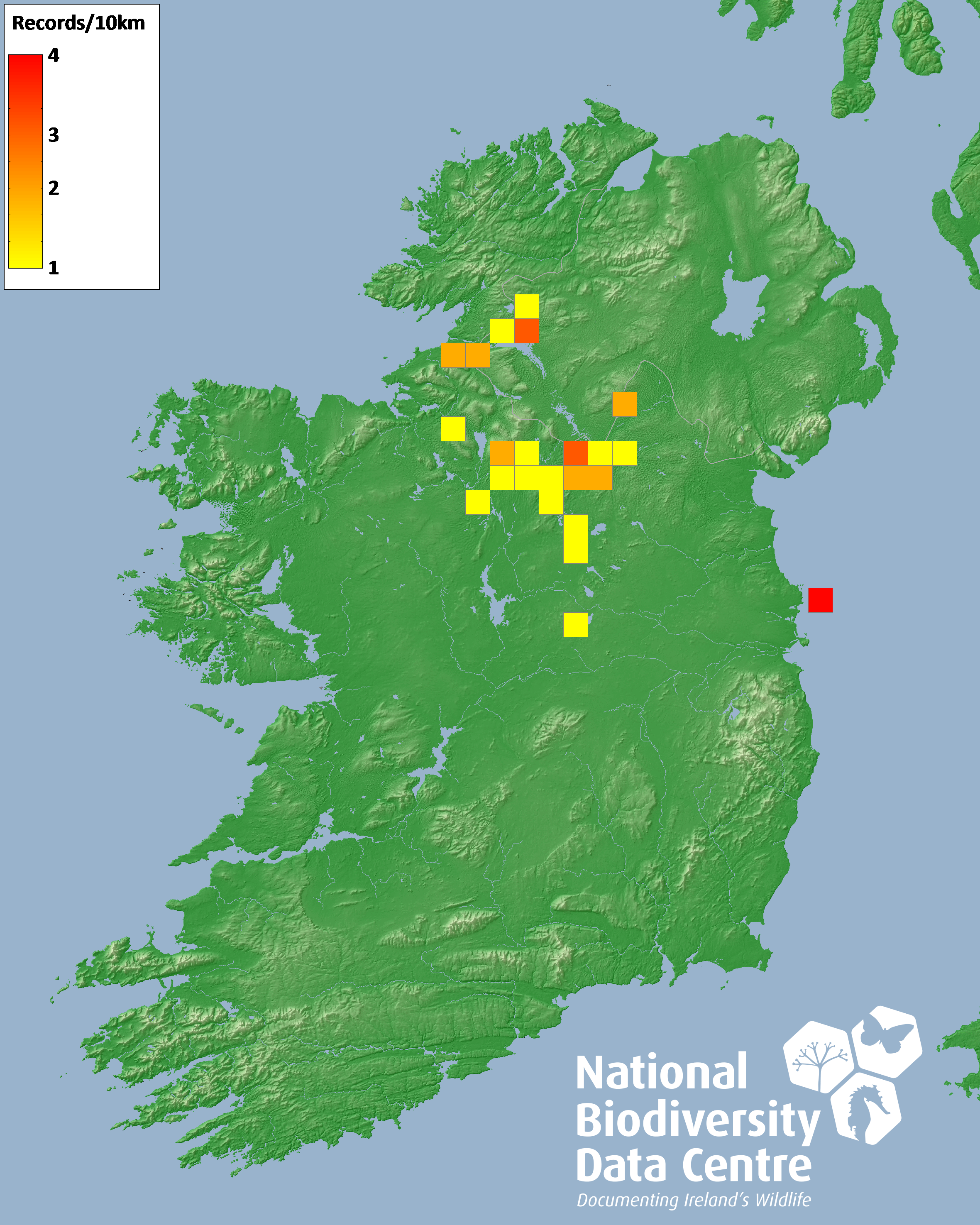 Distribution of the number of records recorded within each 10km grid square (ITM).Marine Map - 50km