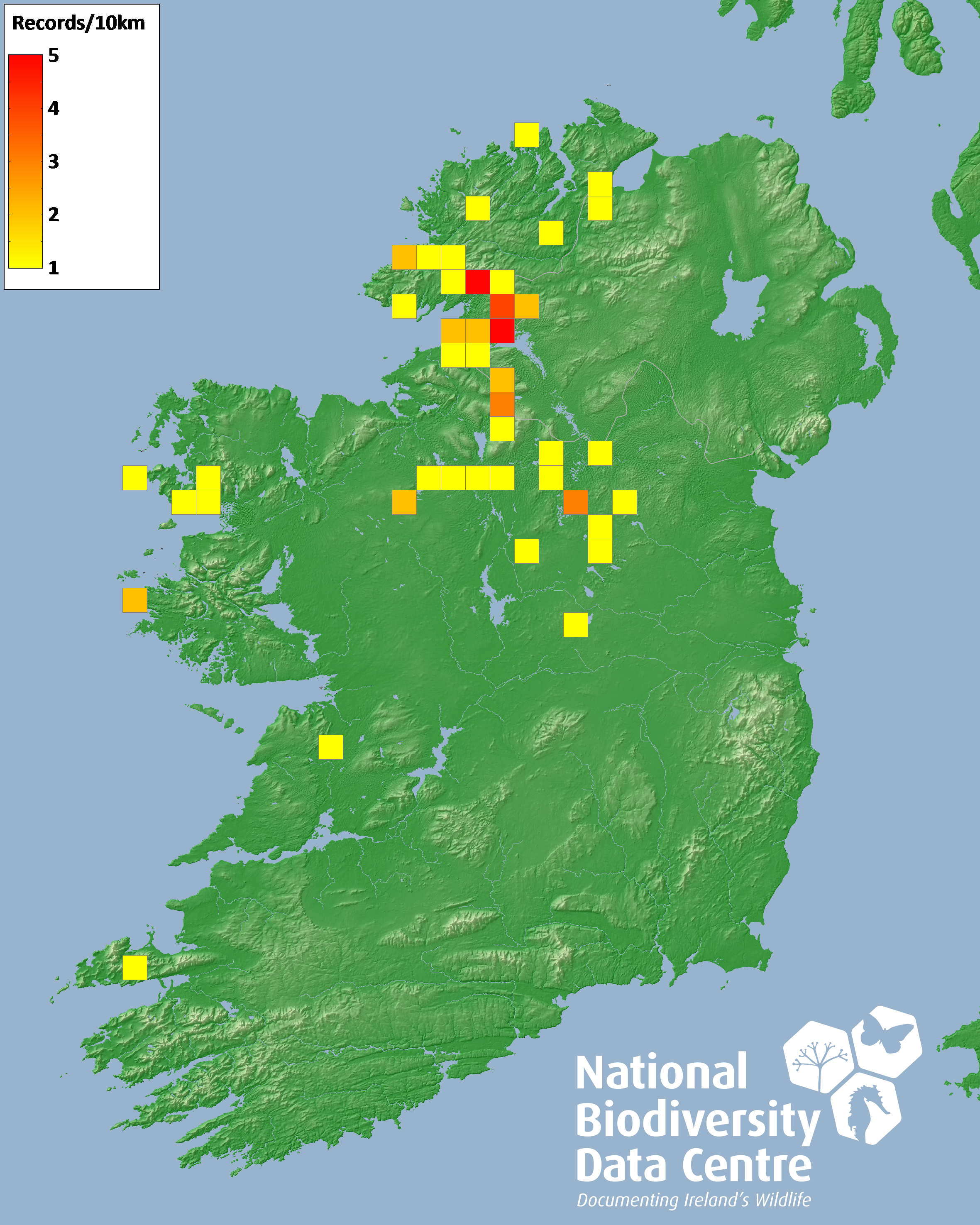 Distribution of the number of records recorded within each 10km grid square (ITM).Marine Map - 50km