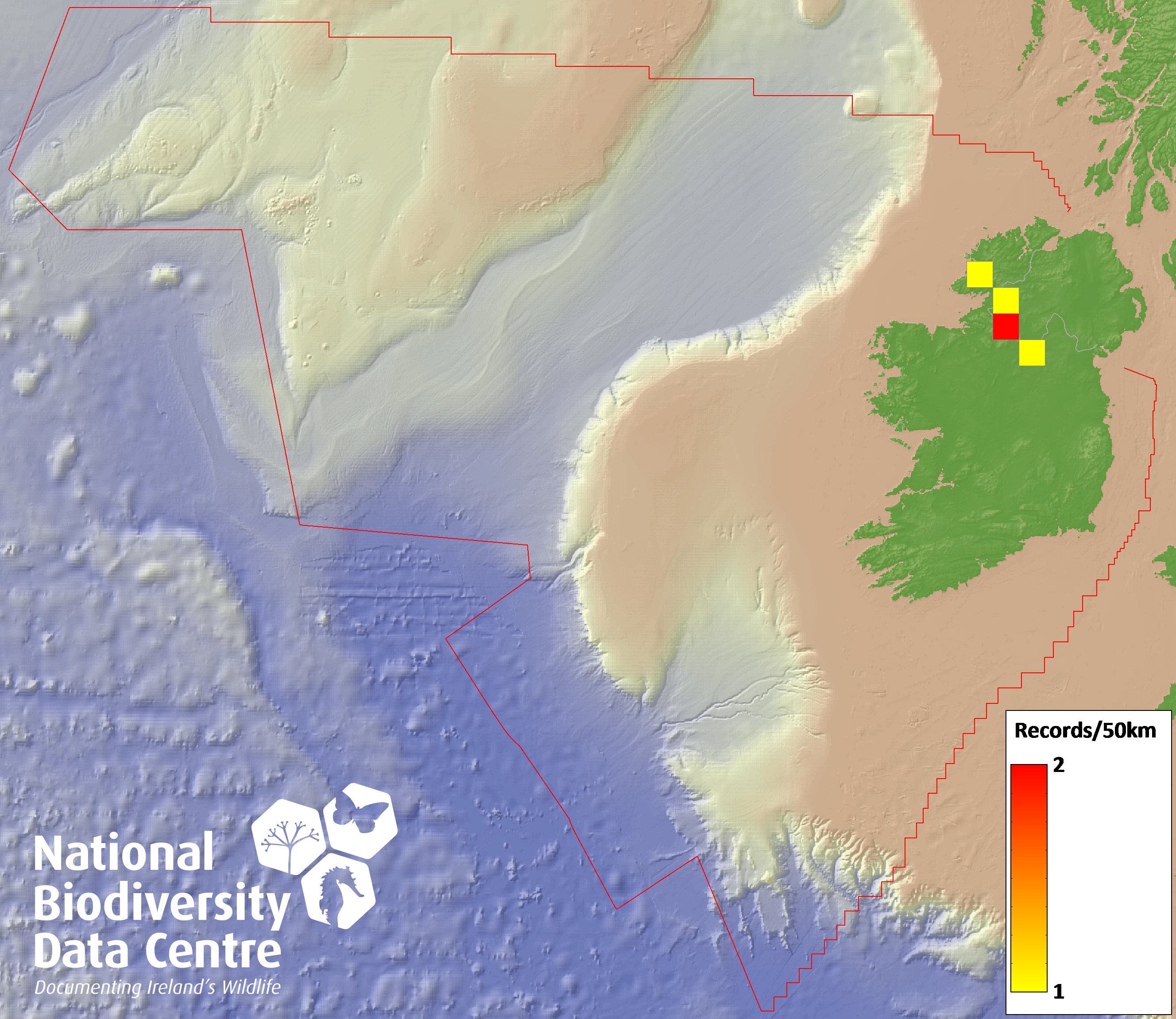 Distribution of the number of records recorded within each 10km grid square (ITM).Marine Map - 50km