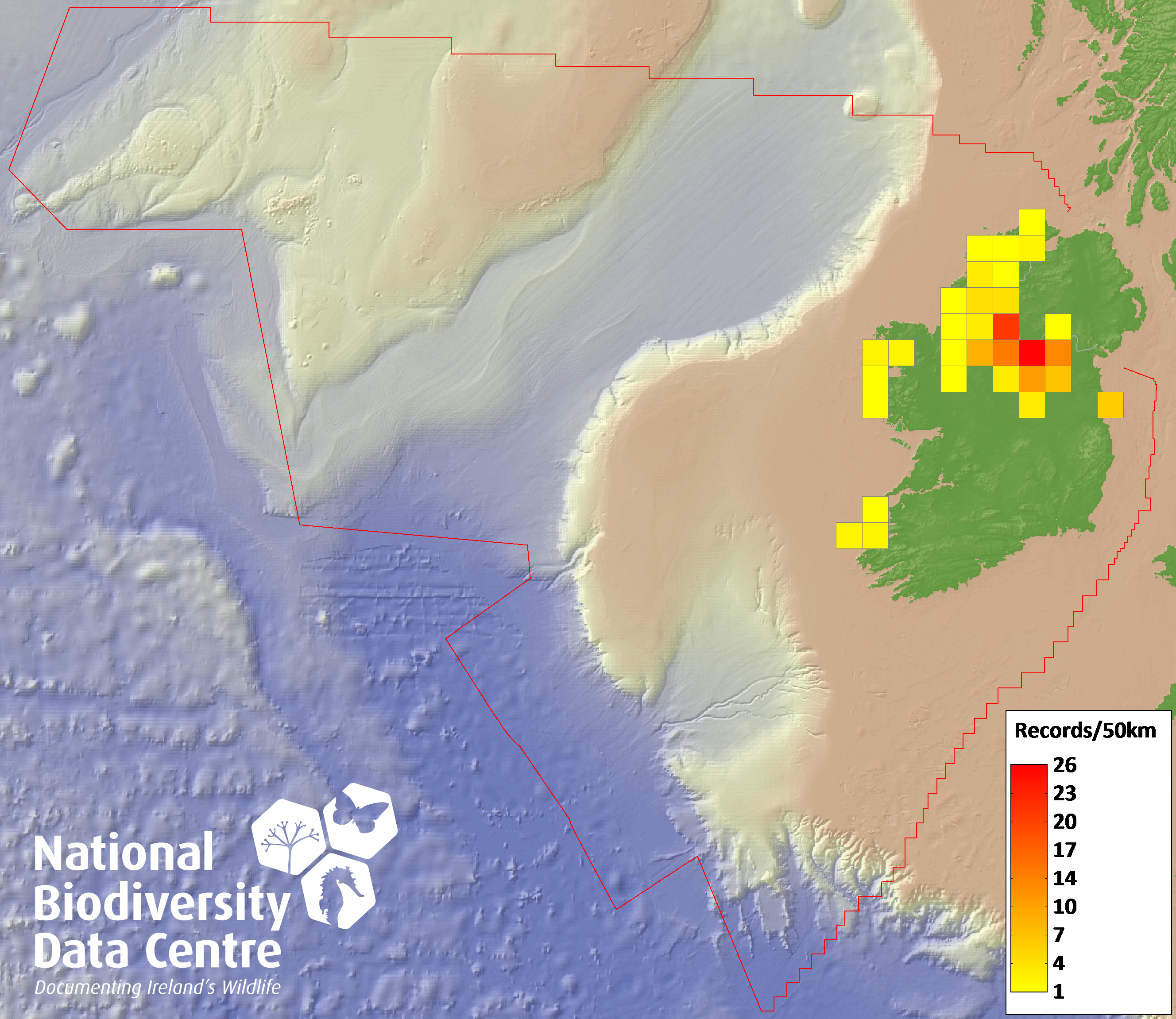 Distribution of the number of records recorded within each 10km grid square (ITM).Marine Map - 50km