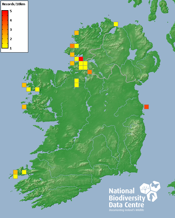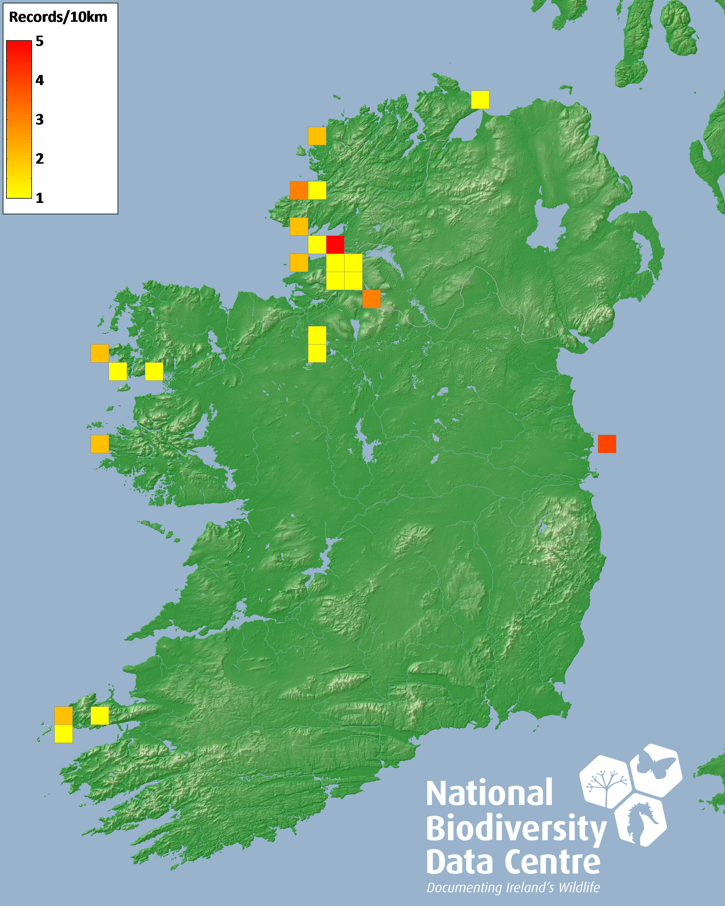 Distribution of the number of records recorded within each 10km grid square (ITM).Marine Map - 50km