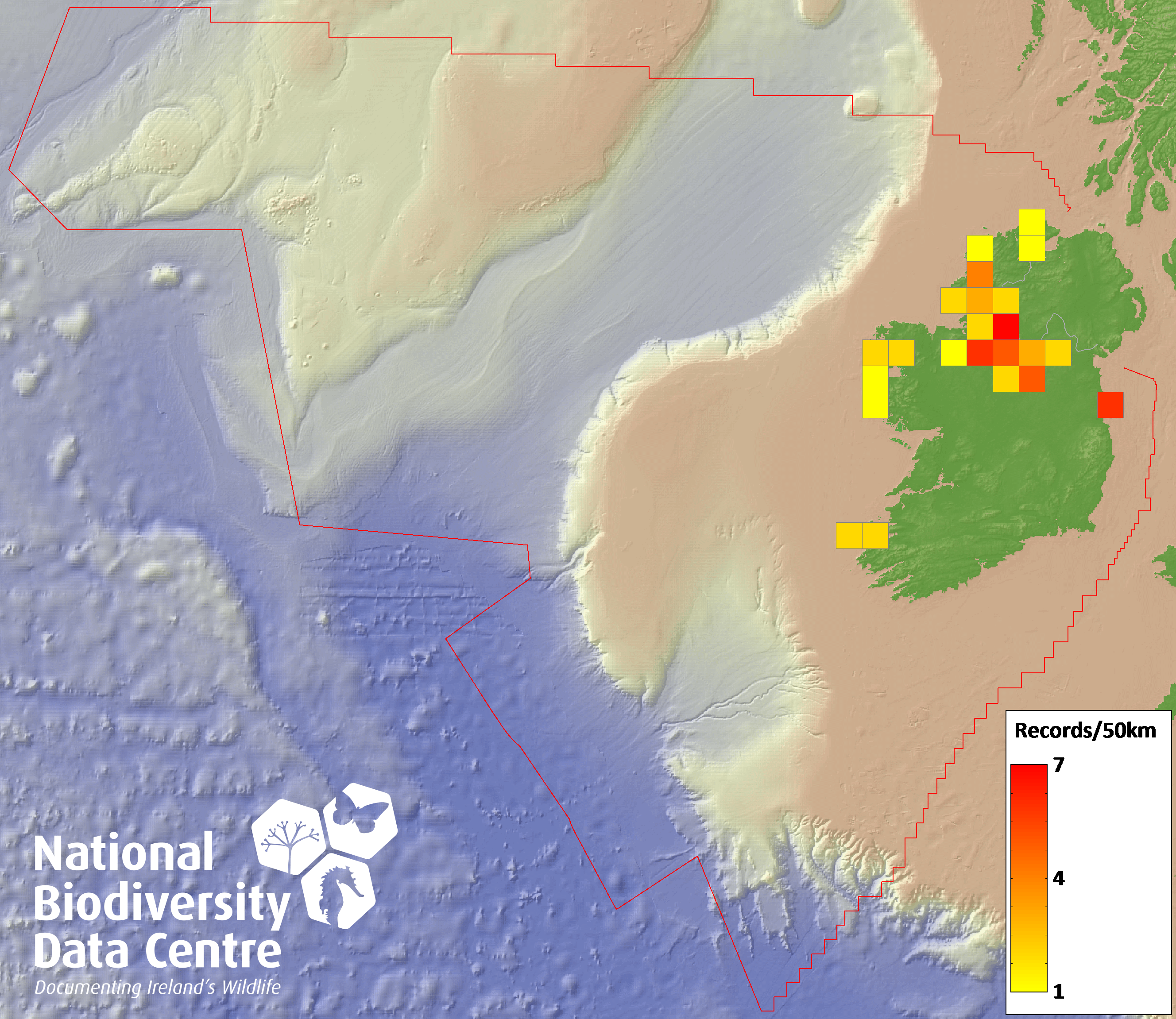 Distribution of the number of records recorded within each 10km grid square (ITM).Marine Map - 50km