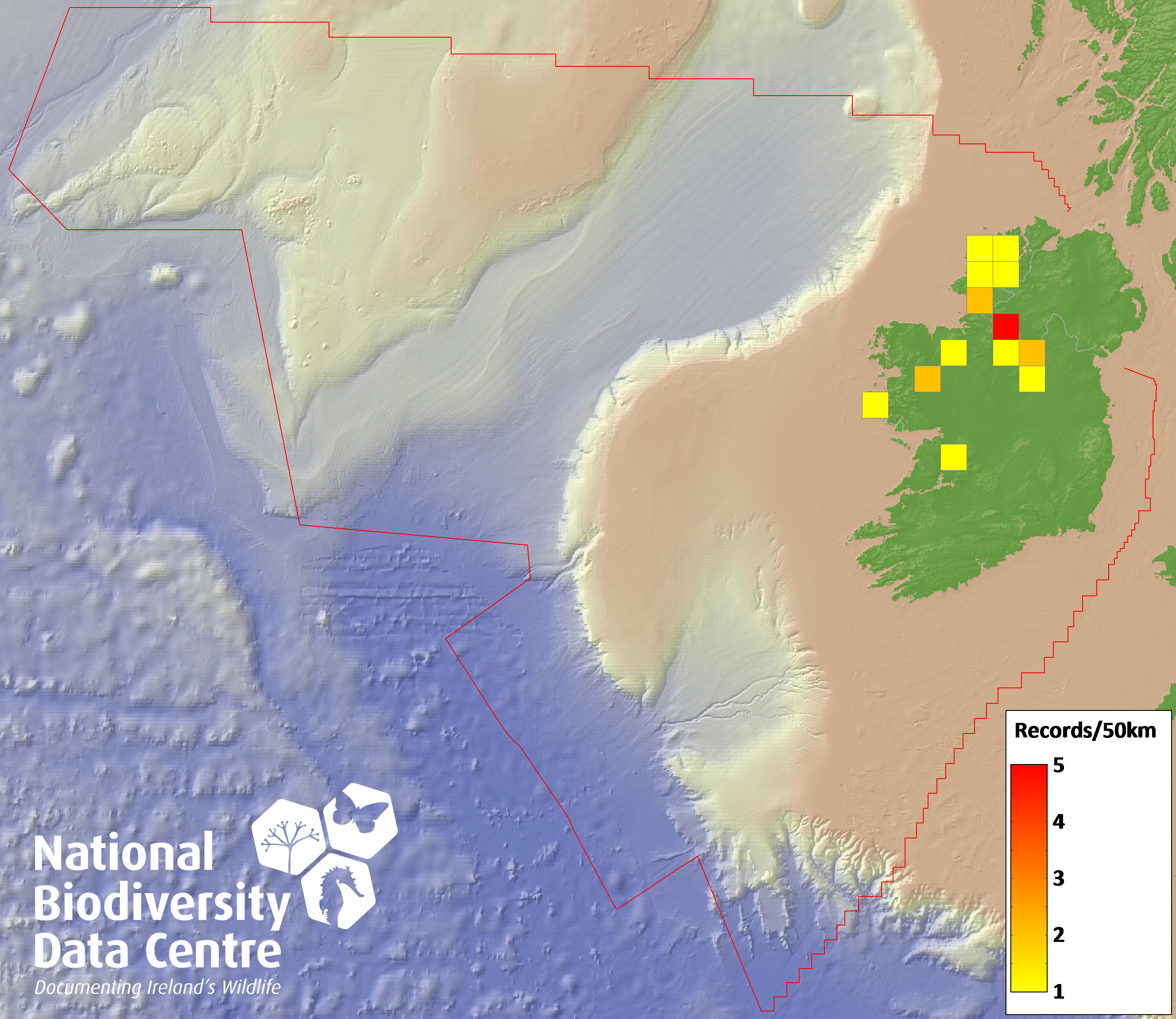 Distribution of the number of records recorded within each 10km grid square (ITM).Marine Map - 50km