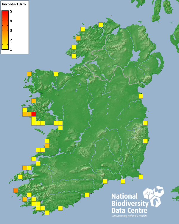 Distribution of the number of records recorded within each 10km grid square (ITM).Marine Map - 50km