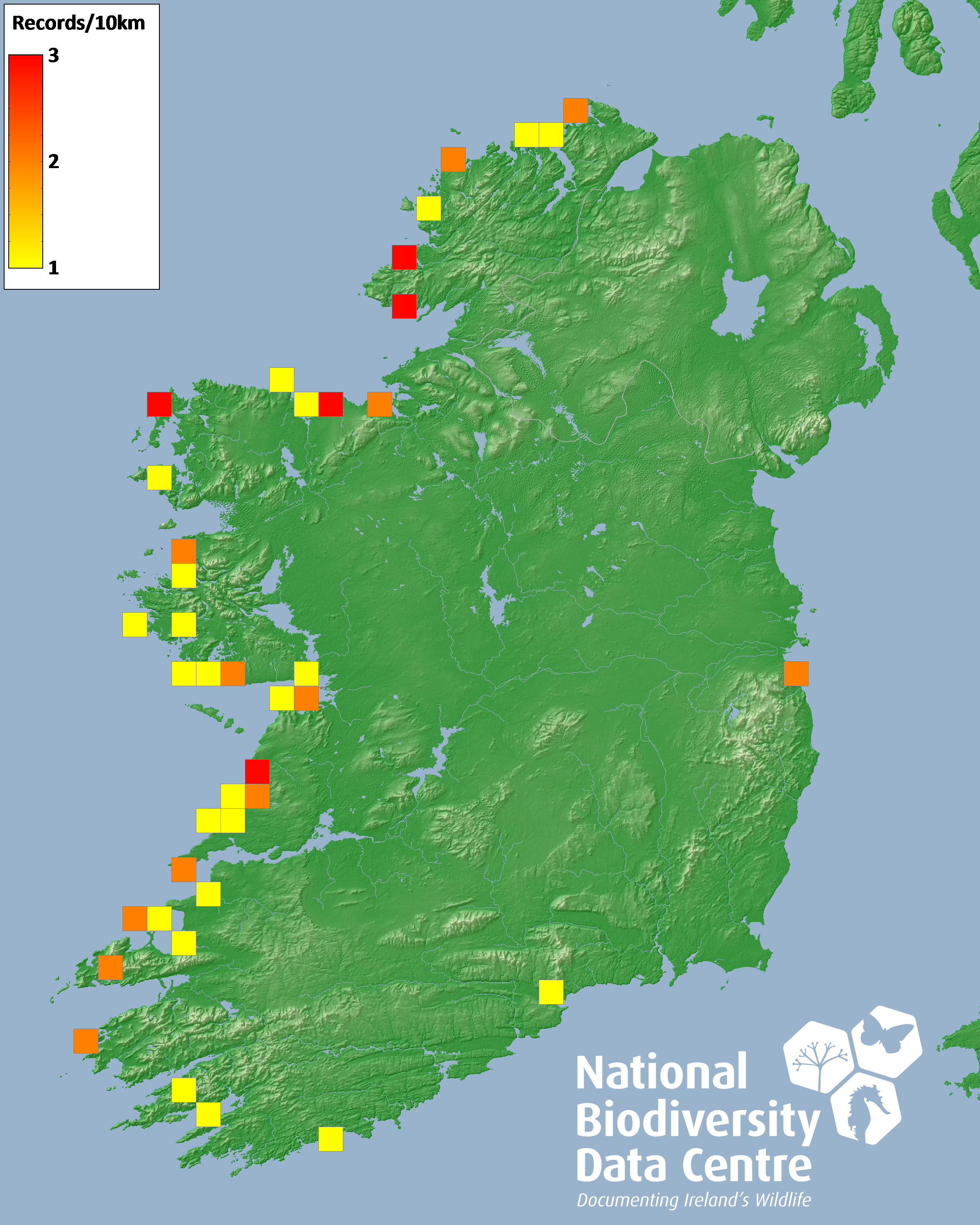Distribution of the number of records recorded within each 10km grid square (ITM).Marine Map - 50km