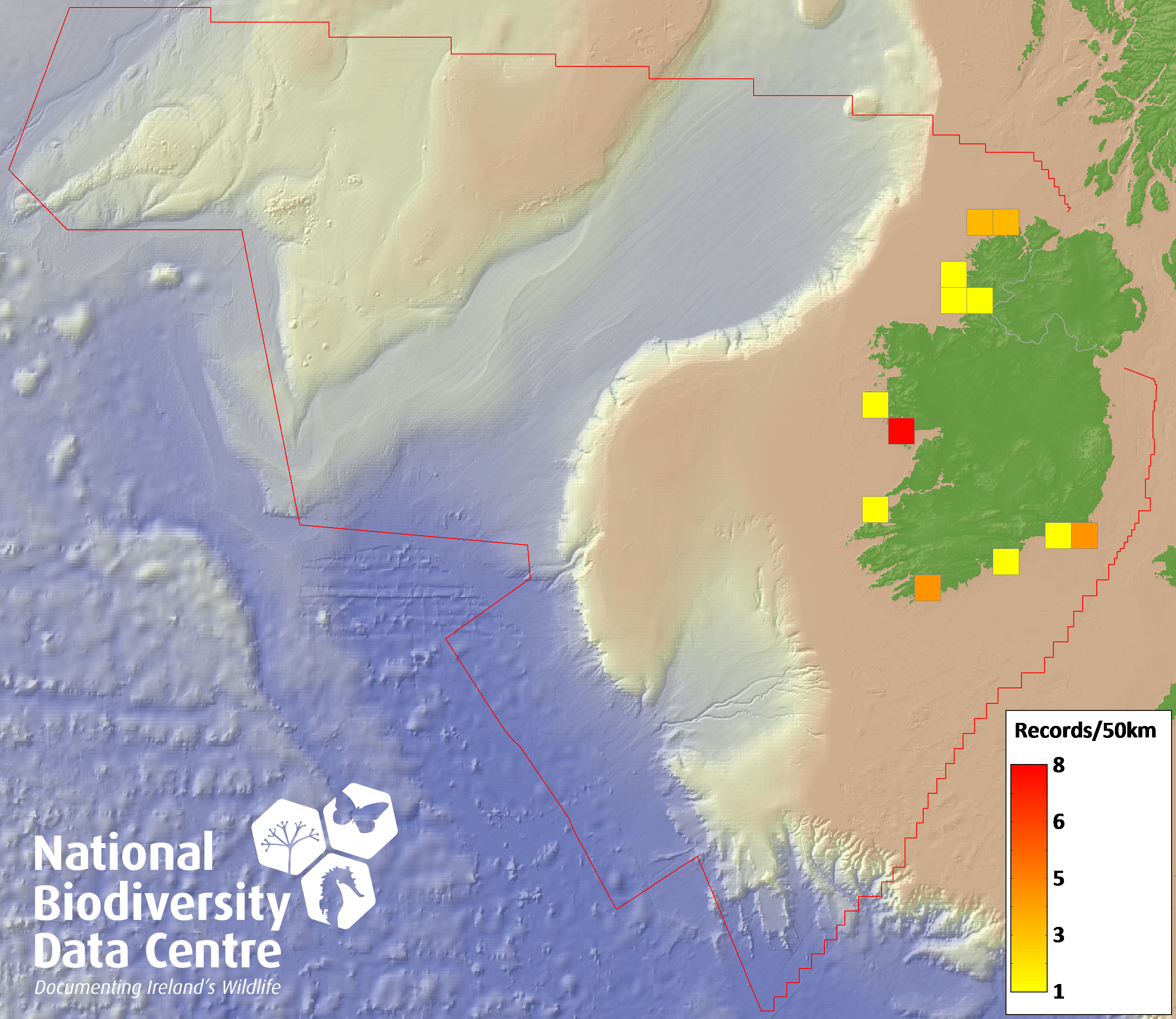 Distribution of the number of records recorded within each 10km grid square (ITM).Marine Map - 50km