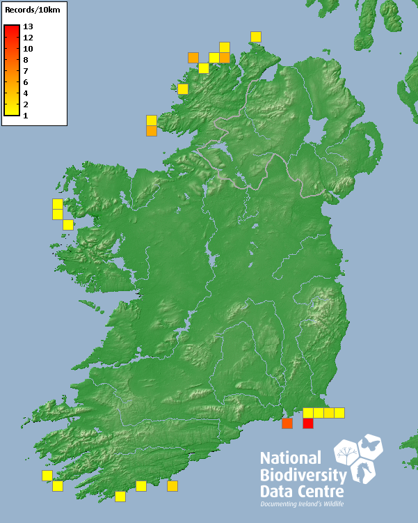 Distribution of the number of records recorded within each 10km grid square (ITM).Marine Map - 50km