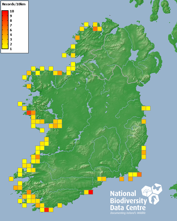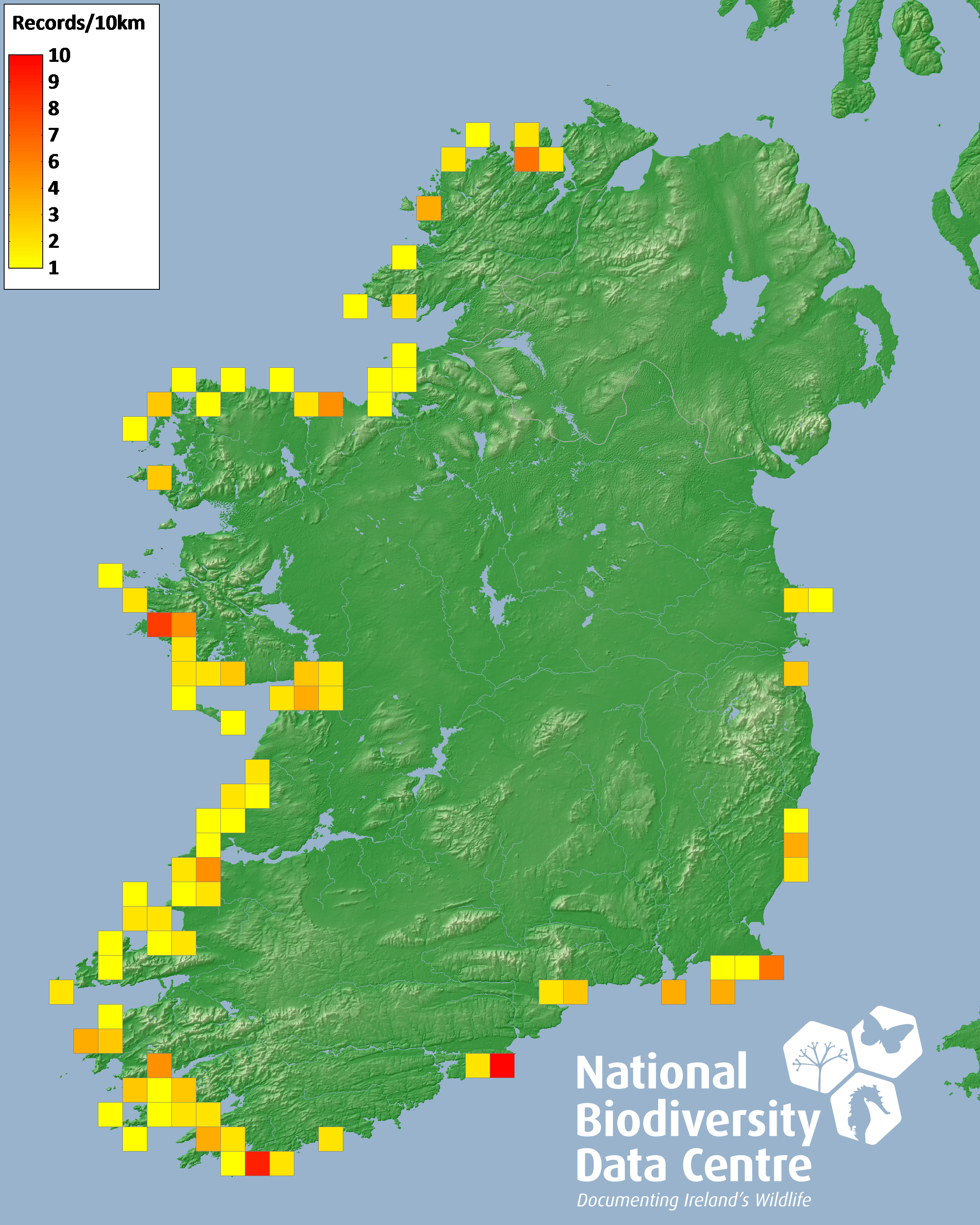Distribution of the number of records recorded within each 10km grid square (ITM).Marine Map - 50km