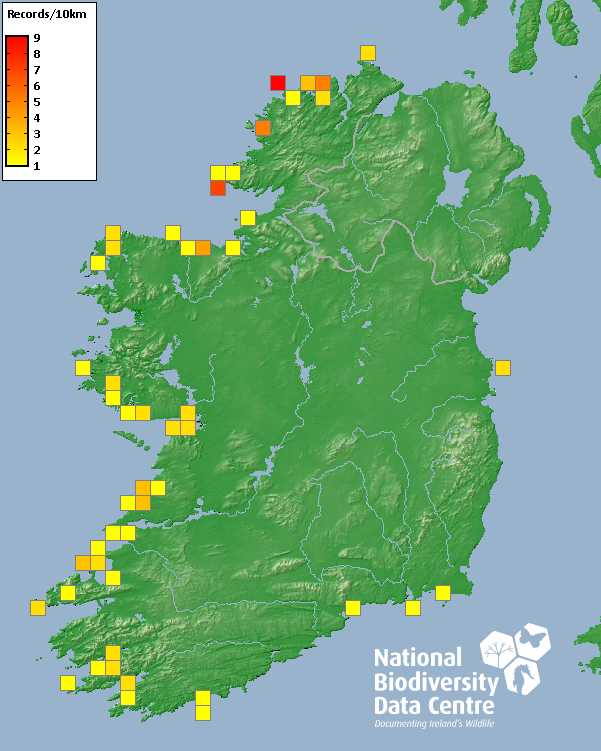 Distribution of the number of records recorded within each 10km grid square (ITM).Marine Map - 50km