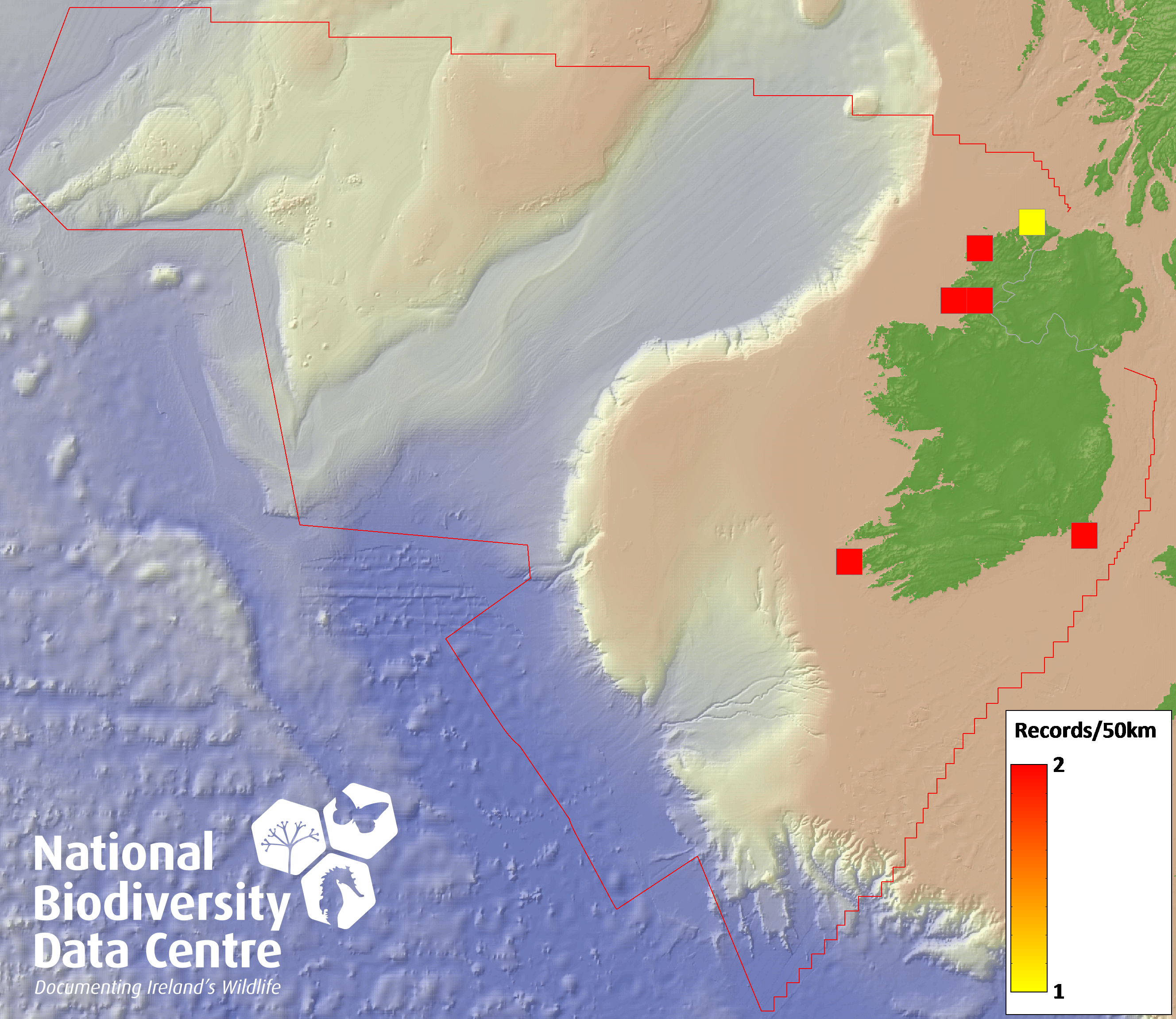 Distribution of the number of records recorded within each 10km grid square (ITM).Marine Map - 50km