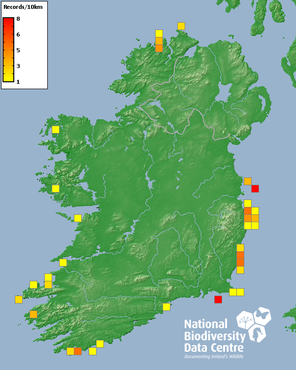 Distribution of the number of records recorded within each 10km grid square (ITM).Marine Map - 50km
