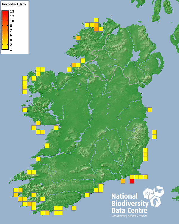 Distribution of the number of records recorded within each 10km grid square (ITM).Marine Map - 50km