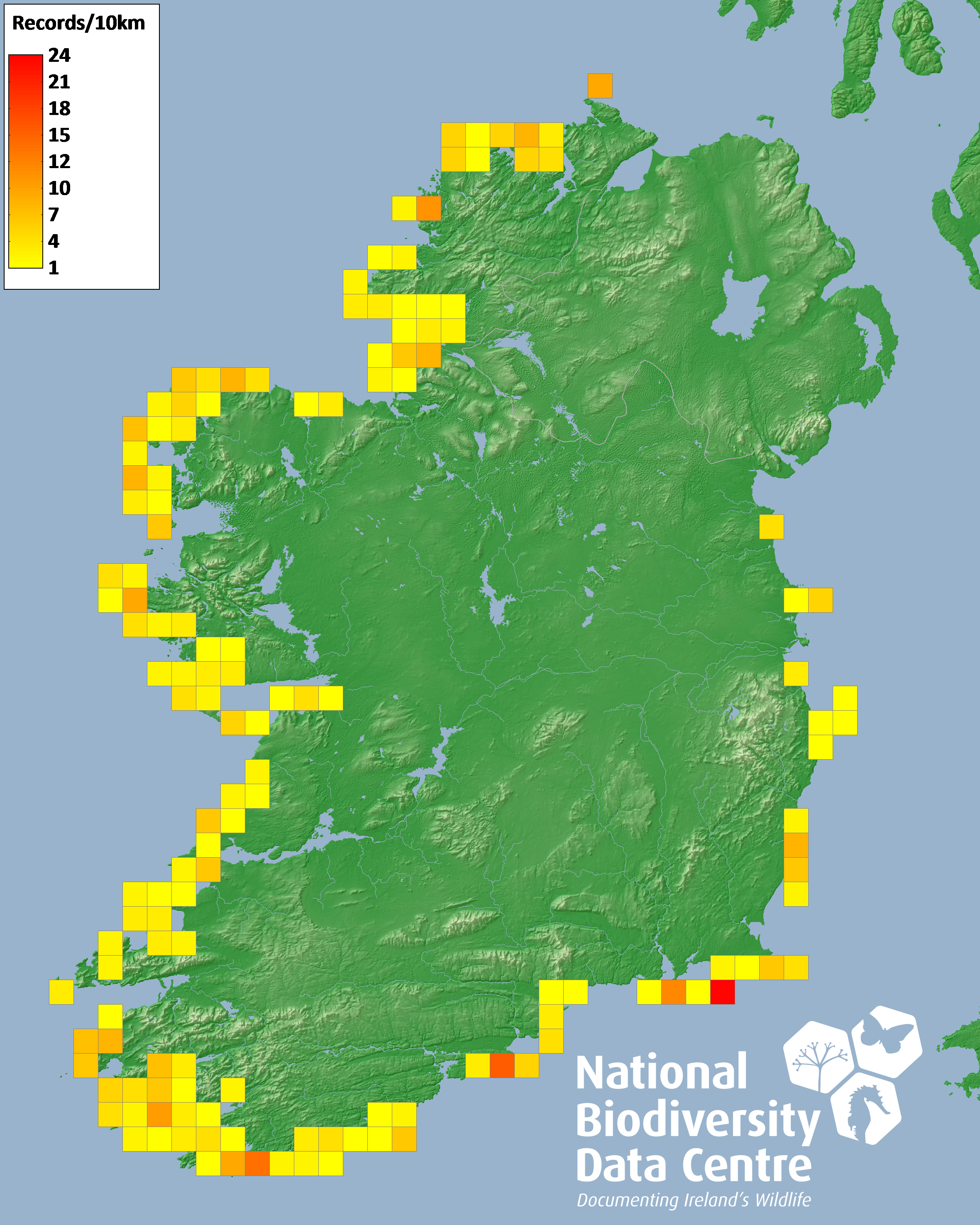 Distribution of the number of records recorded within each 10km grid square (ITM).Marine Map - 50km
