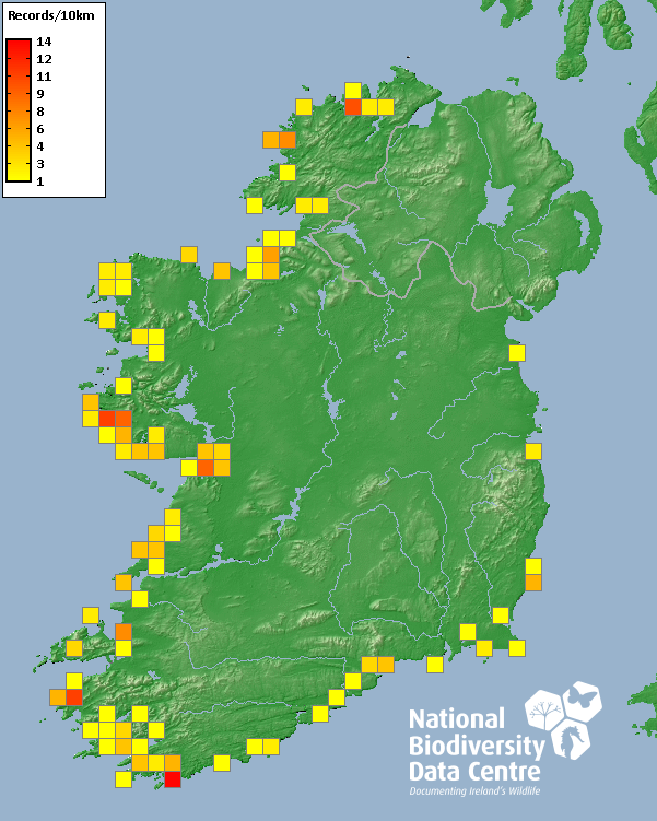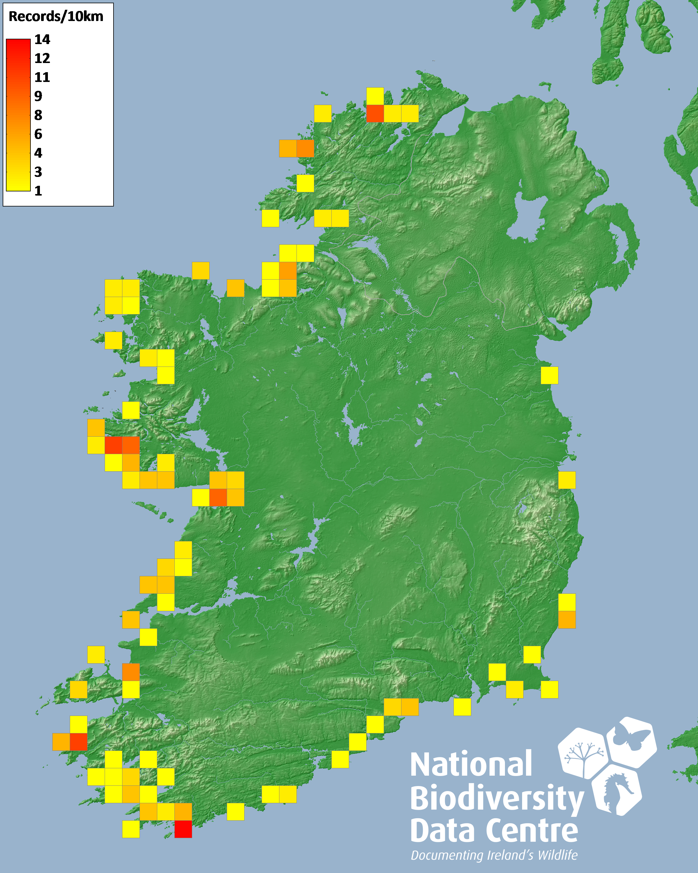 Distribution of the number of records recorded within each 10km grid square (ITM).Marine Map - 50km