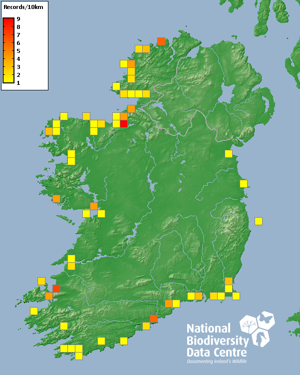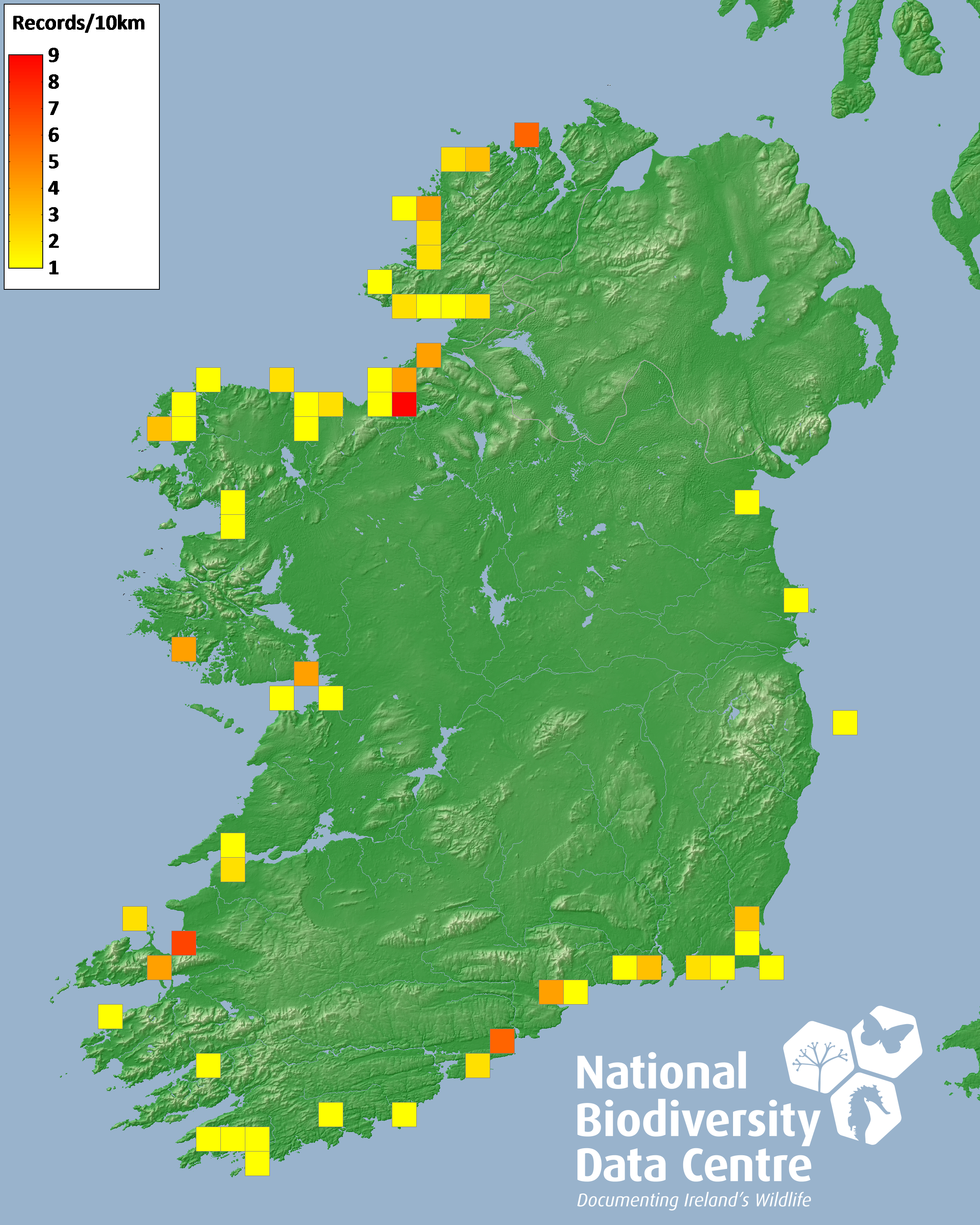 Distribution of the number of records recorded within each 10km grid square (ITM).Marine Map - 50km