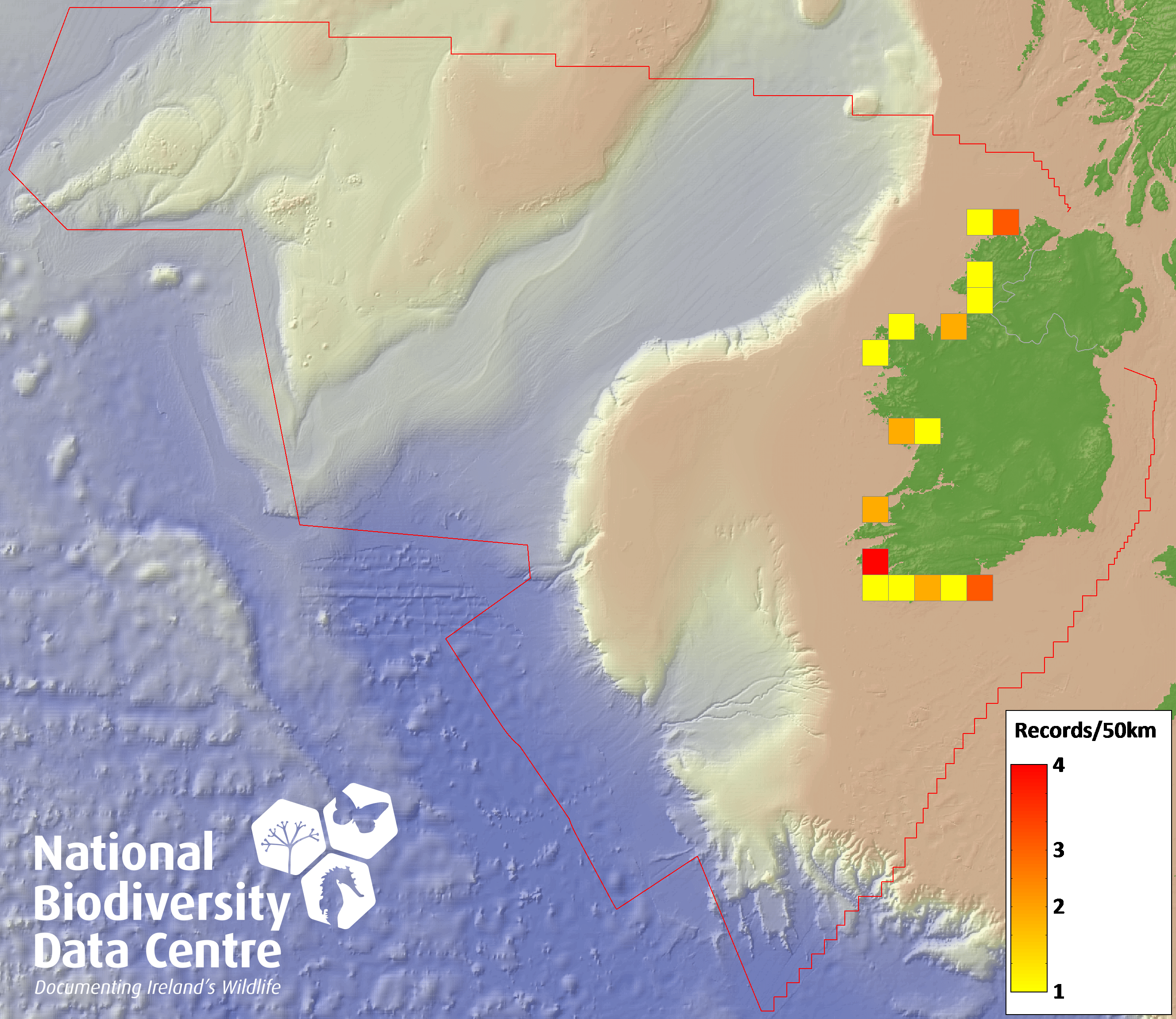 Distribution of the number of records recorded within each 10km grid square (ITM).Marine Map - 50km