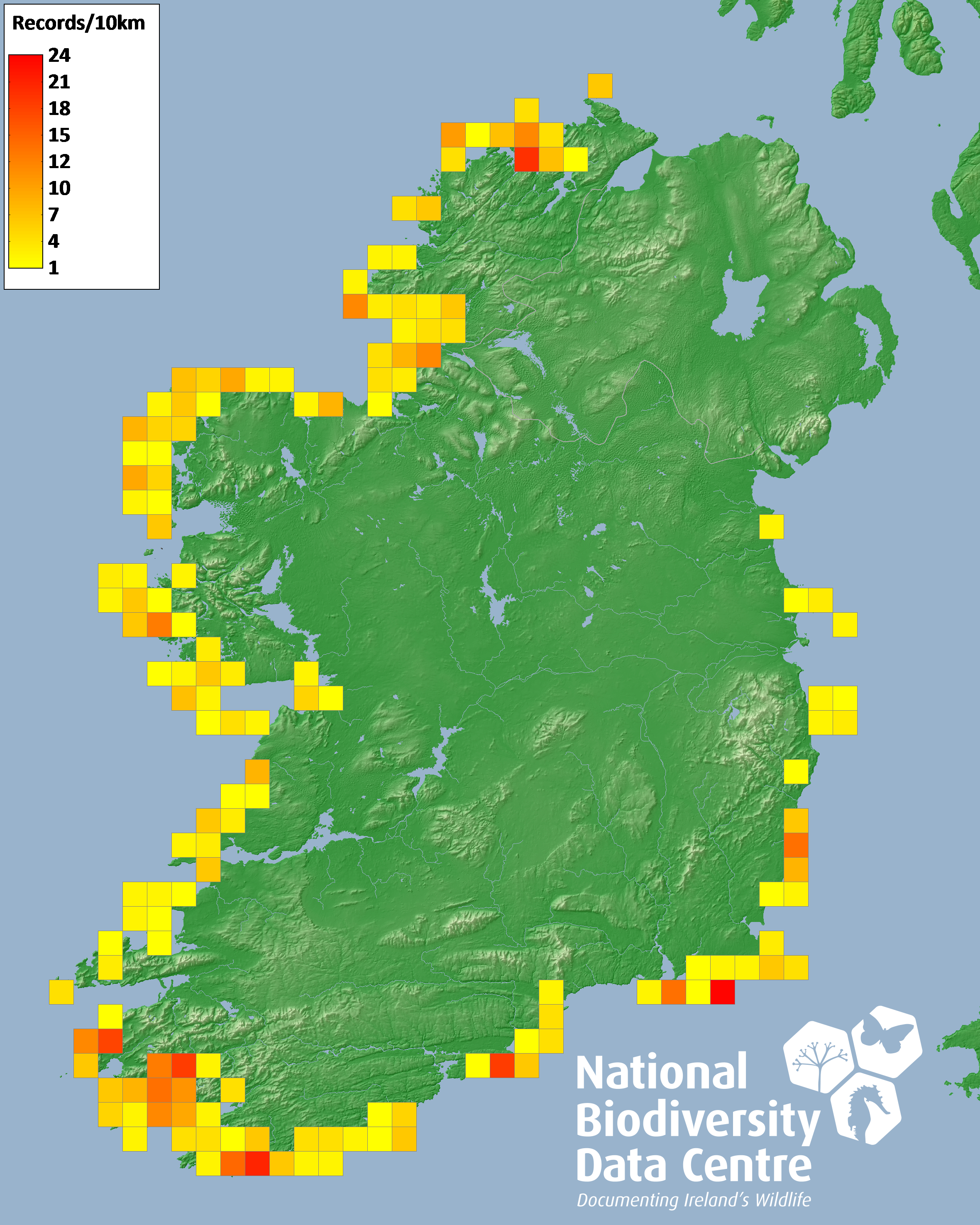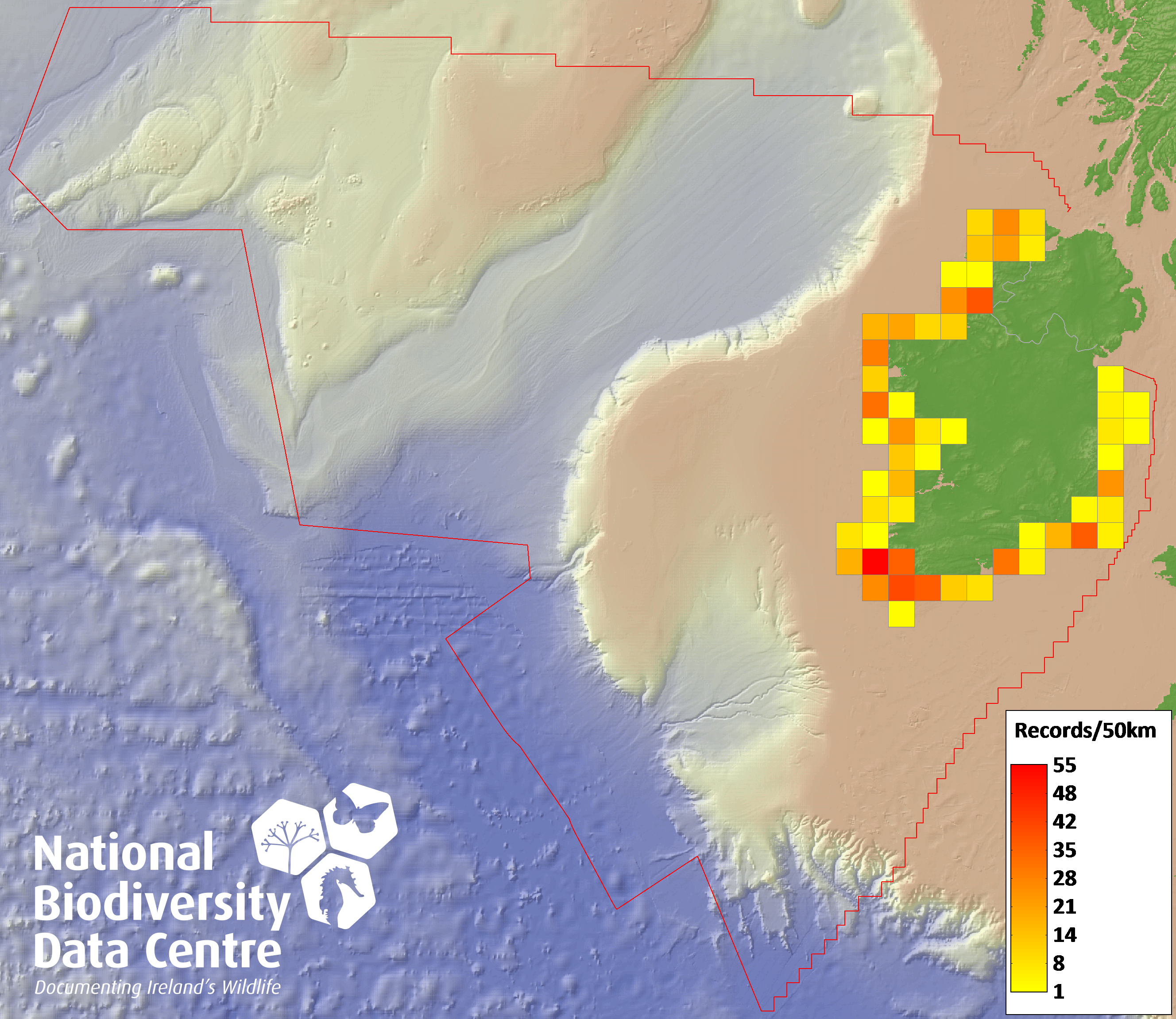 Distribution of the number of records recorded within each 10km grid square (ITM).Marine Map - 50km