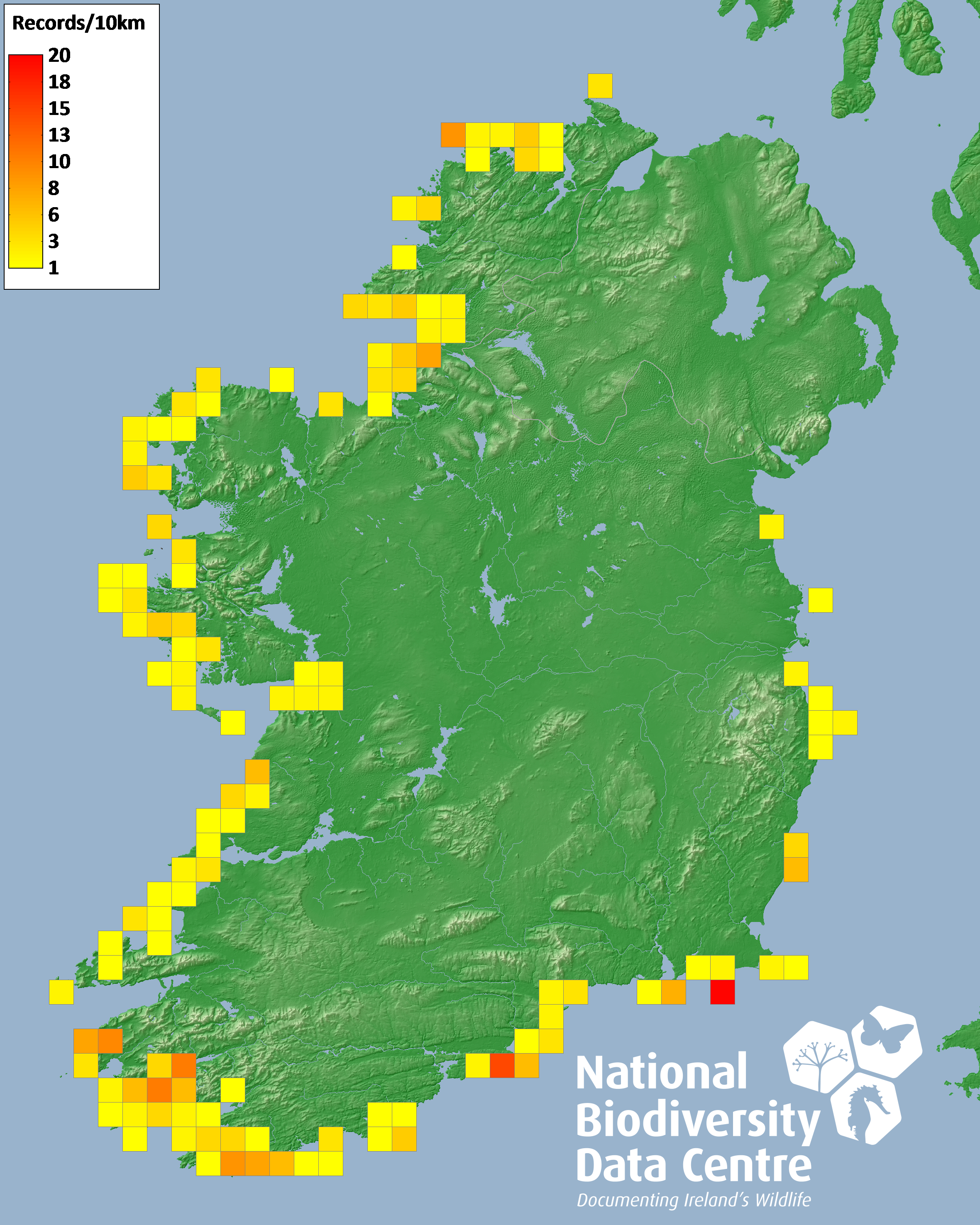 Distribution of the number of records recorded within each 10km grid square (ITM).Marine Map - 50km