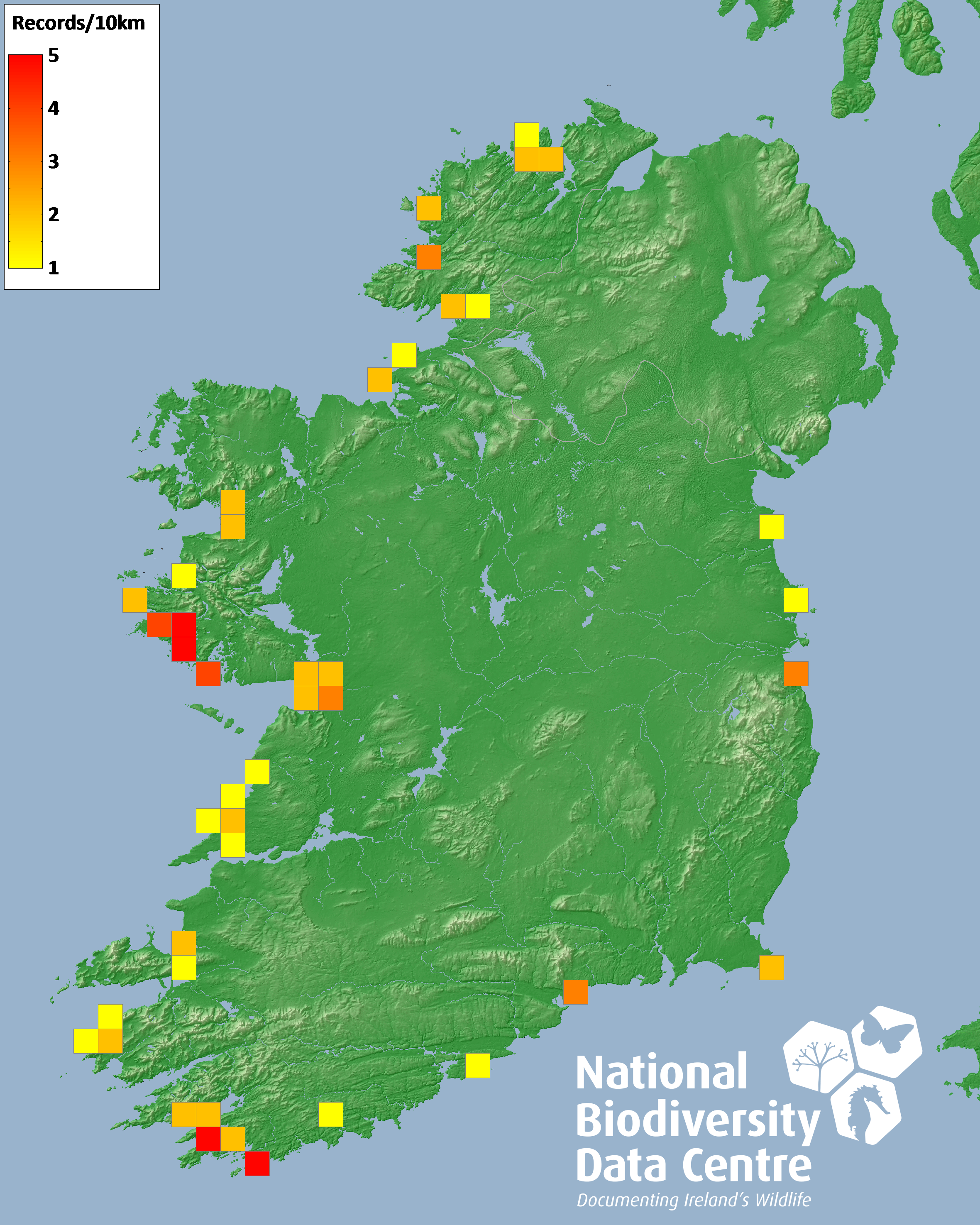 Distribution of the number of records recorded within each 10km grid square (ITM).Marine Map - 50km
