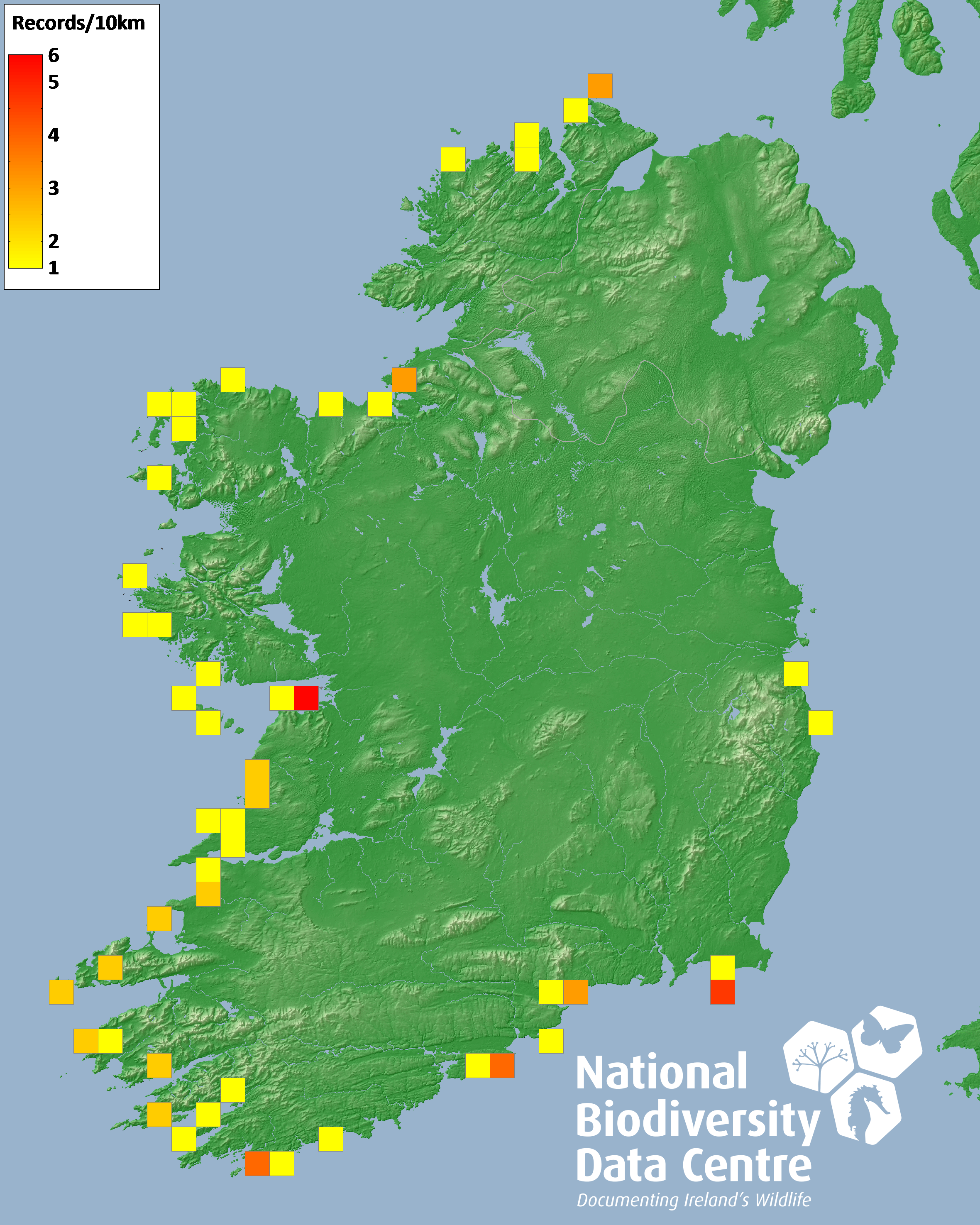 Distribution of the number of records recorded within each 10km grid square (ITM).Marine Map - 50km