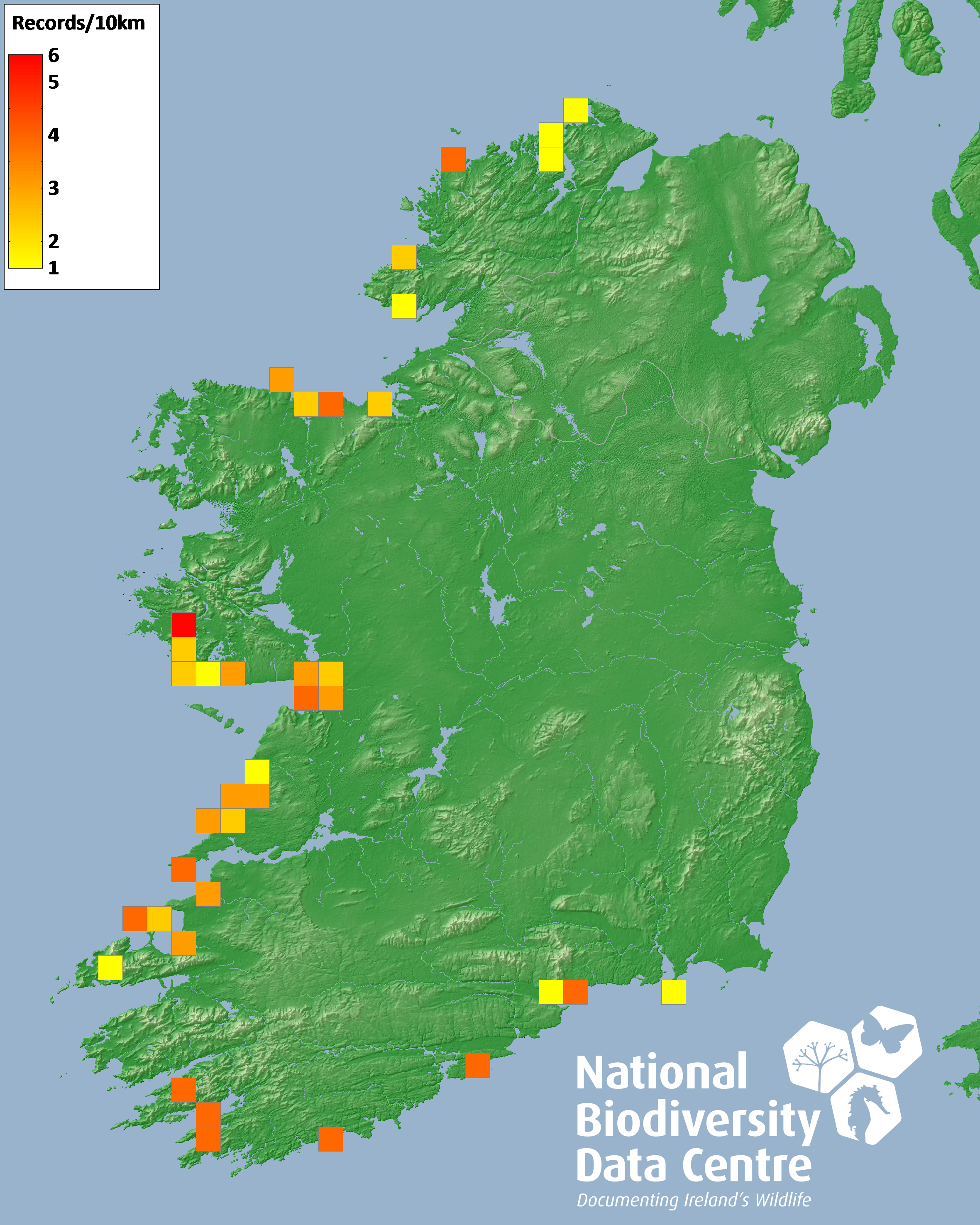 Distribution of the number of records recorded within each 10km grid square (ITM).Marine Map - 50km