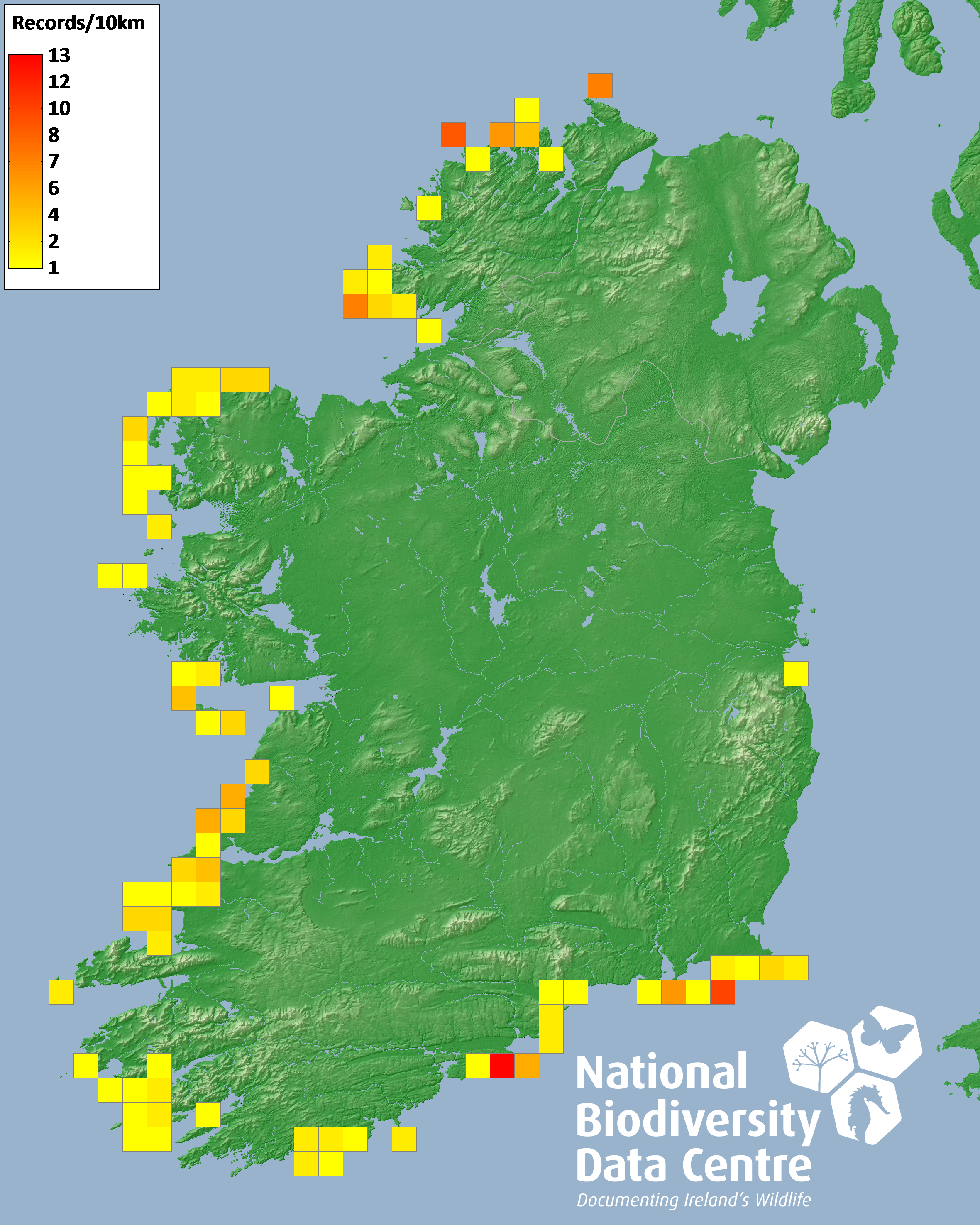 Distribution of the number of records recorded within each 10km grid square (ITM).Marine Map - 50km