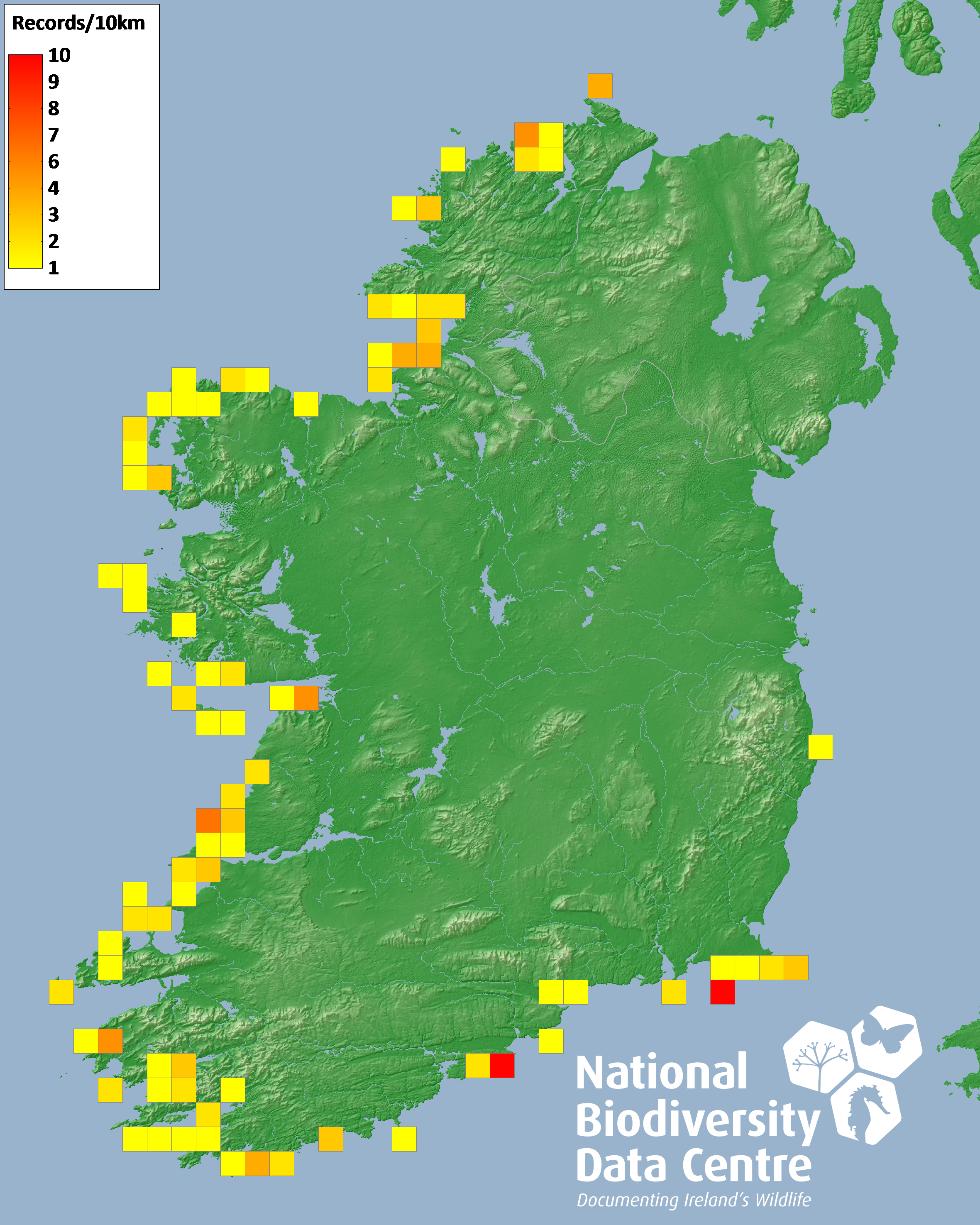 Distribution of the number of records recorded within each 10km grid square (ITM).Marine Map - 50km