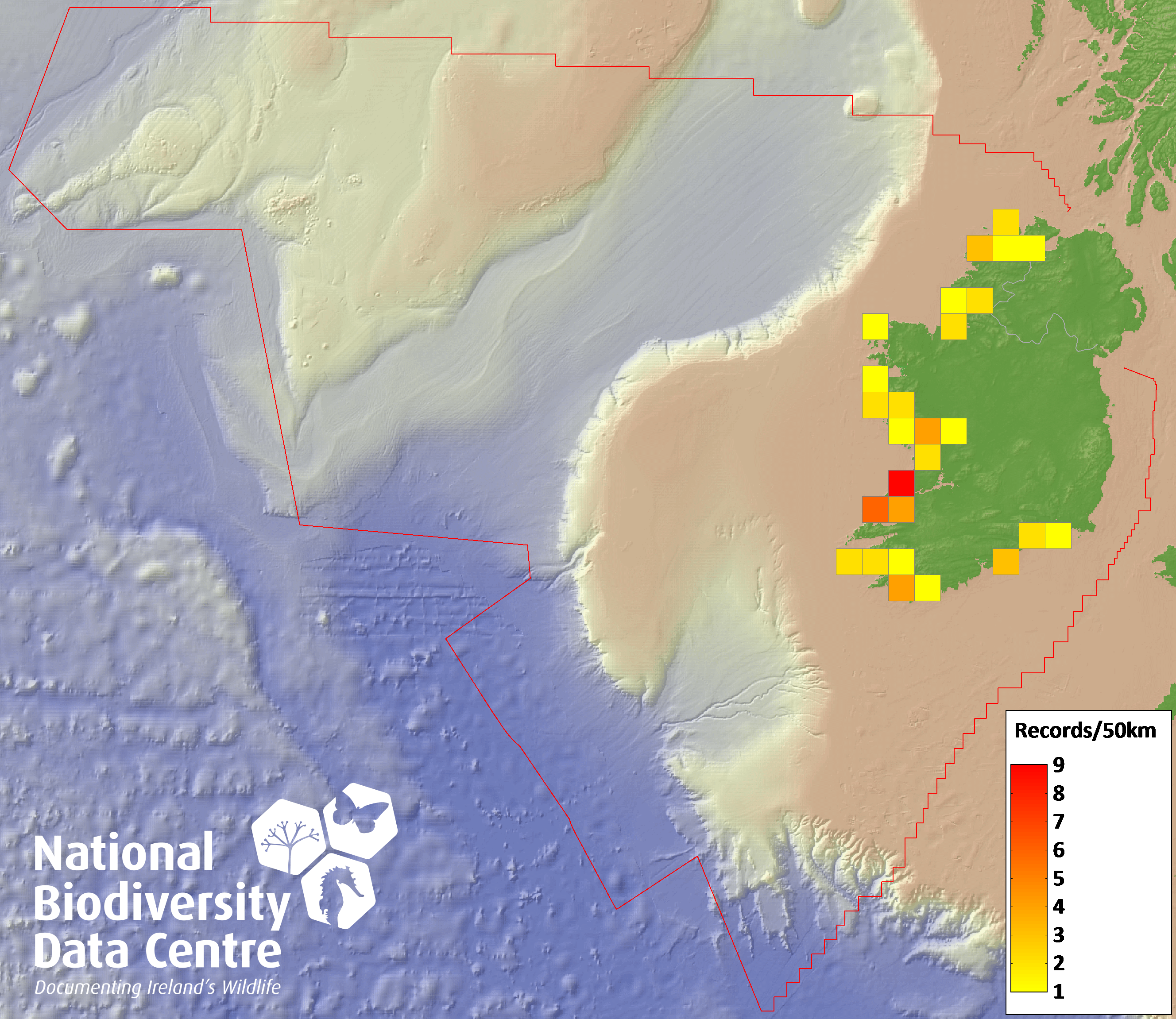 Distribution of the number of records recorded within each 10km grid square (ITM).Marine Map - 50km