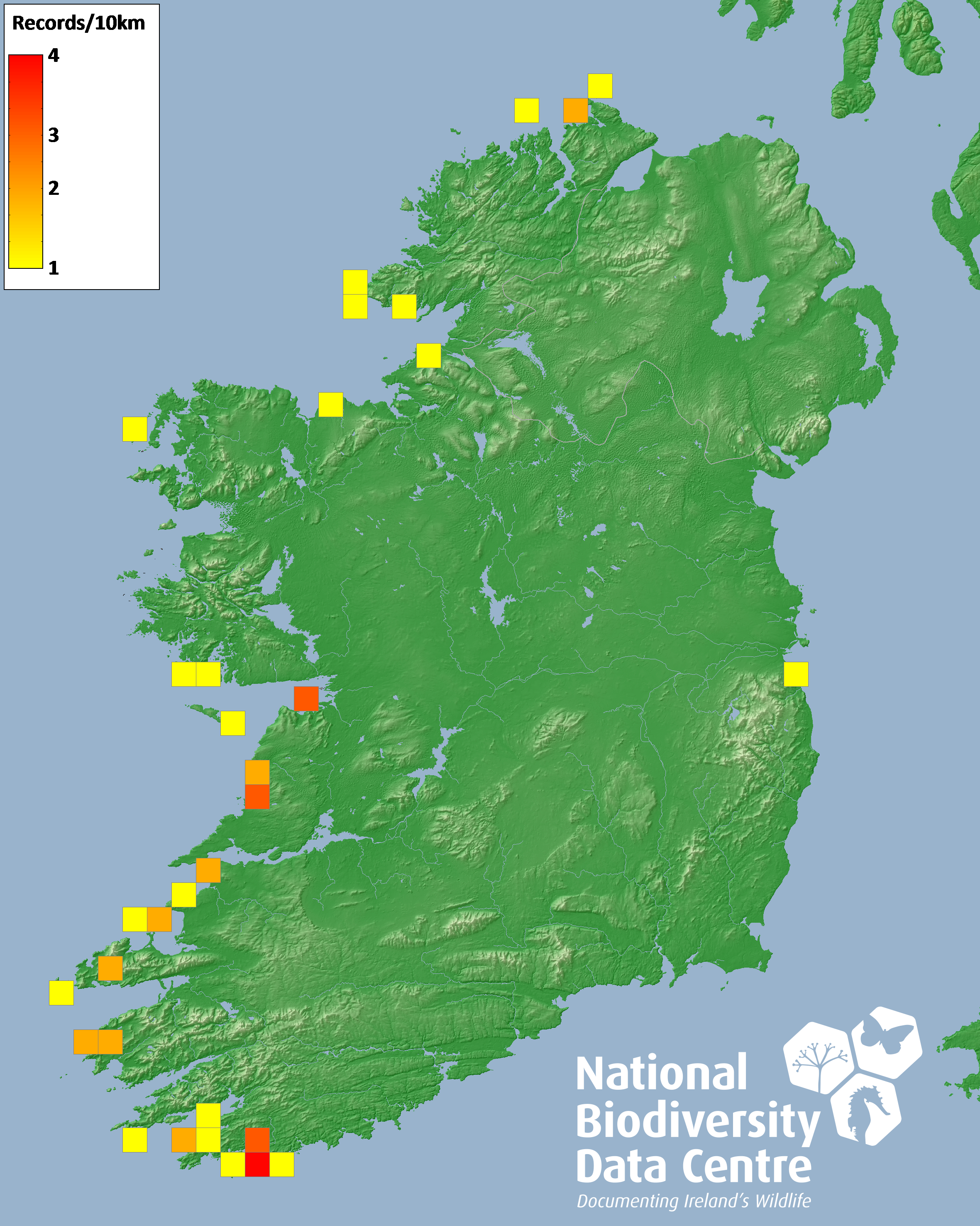 Distribution of the number of records recorded within each 10km grid square (ITM).Marine Map - 50km