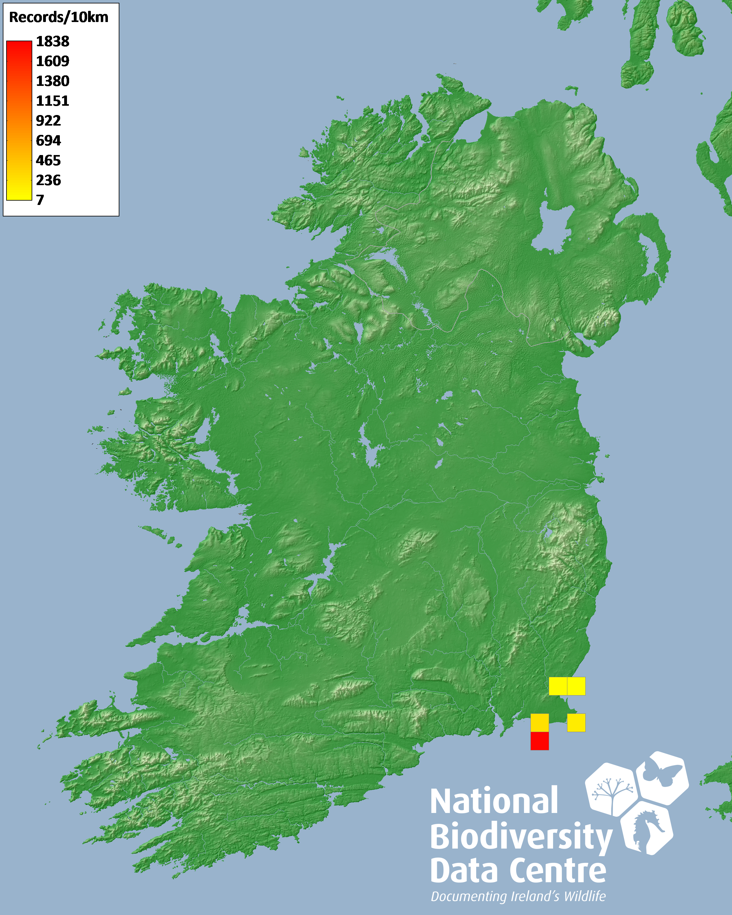 Distribution of the number of records within each 10km grid square (ITM).Marine Map - 50Km