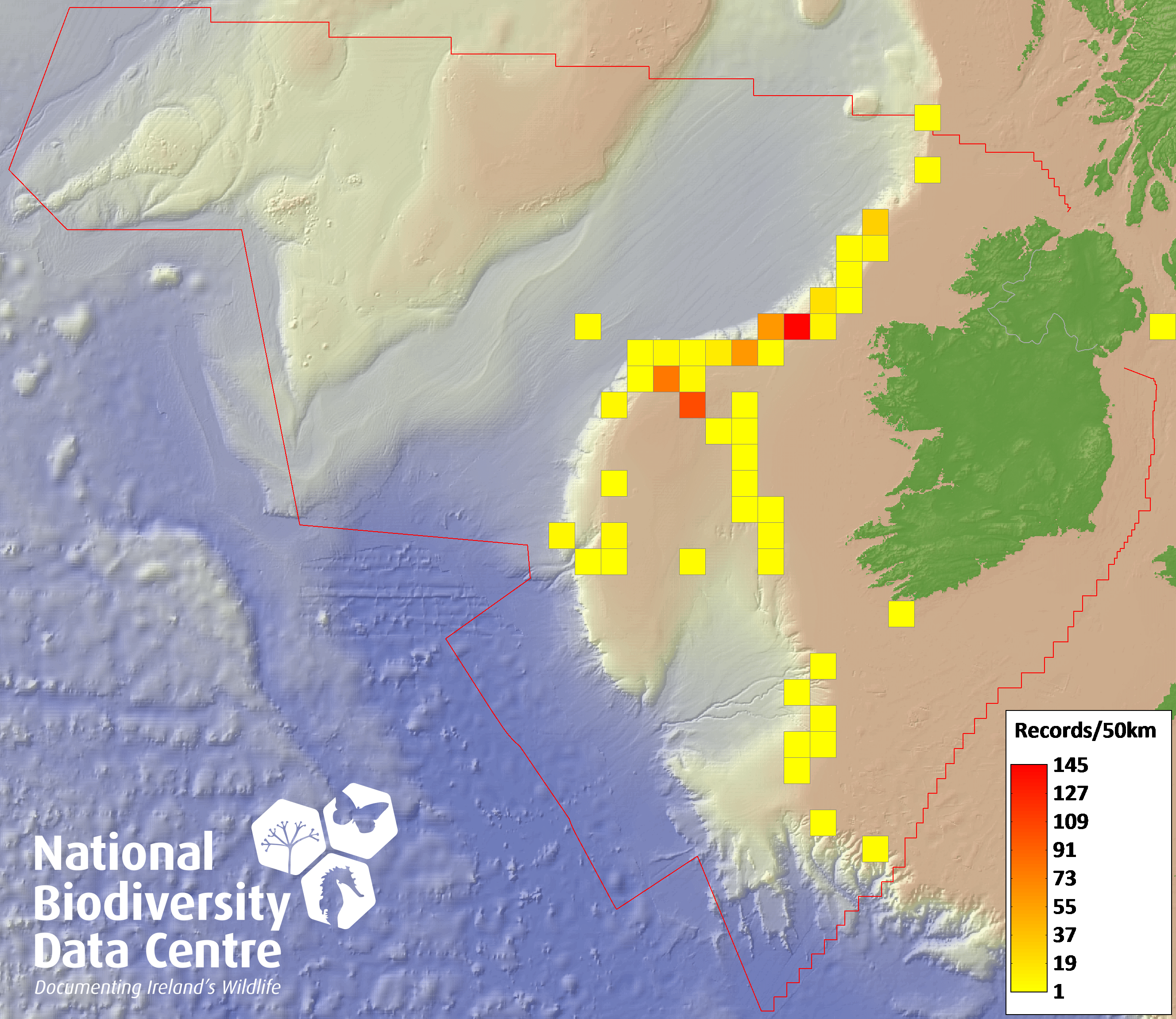 Distribution of the number of records recorded within each 10km grid square (ITM).Marine Map - 50km